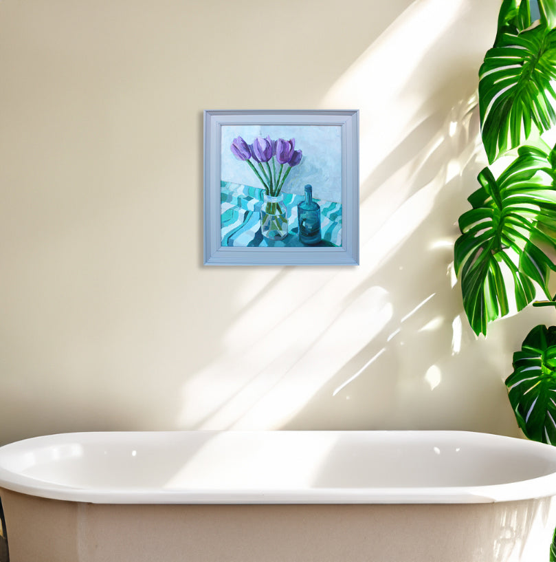 This artwork comes in a light grey, wooden frame.