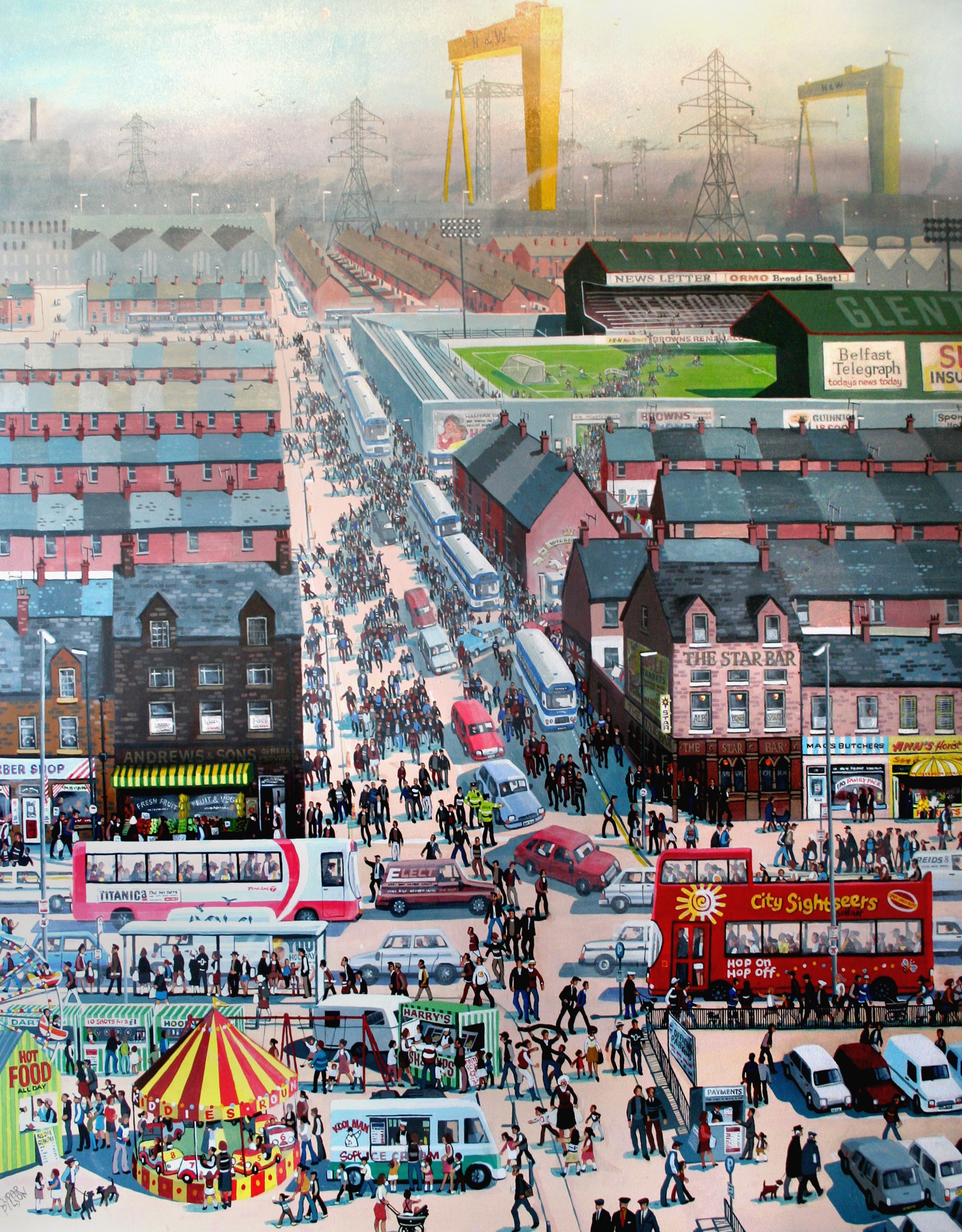 'After The Match, East Belfast' is a signed, limited edition Giclee print by Cupar Pilson.