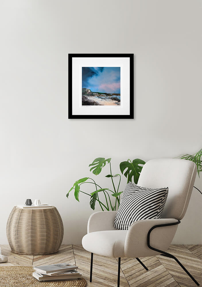 This print comes unframed with a single mount. The smaller framed option comes in a black or white, wooden frame with a single mount. The larger framed option comes in a black or white, wooden frame with a double mount.
