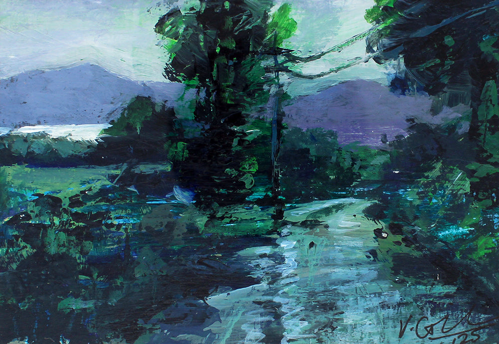 'Bog Road 3' is a signed, original, acrylic painting by Valerie Giannandrea McKeag.