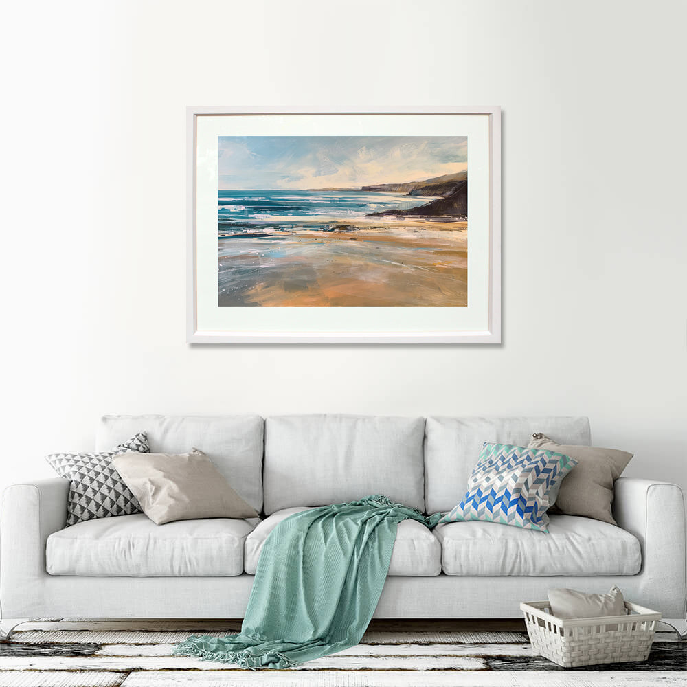 This artwork comes in a distressed, white wooden frame with a white mount.
