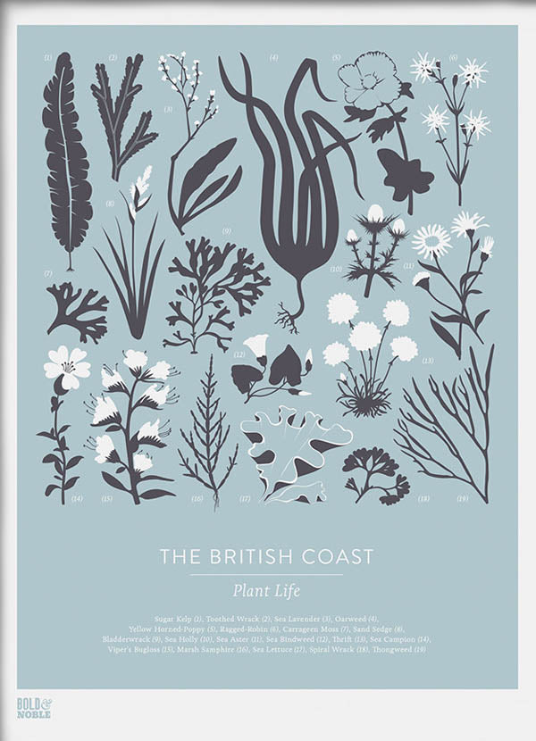 'British Coast Plants in Blue' is an open edition hand-pulled screen print by Bold and Noble.