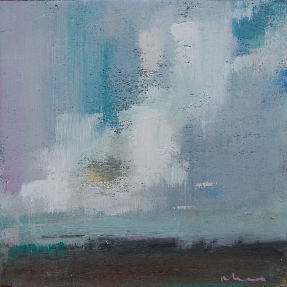 'Clouds' is a signed, oil painting on wood by Elaine Murdock framed in an oak tray frame.