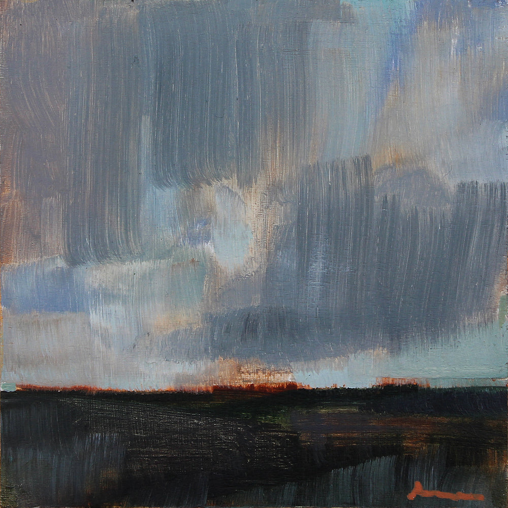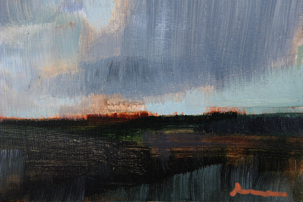 'Clouds On The Moor' is a signed, oil painting on wood by Elaine Murdock framed in an oak tray frame.