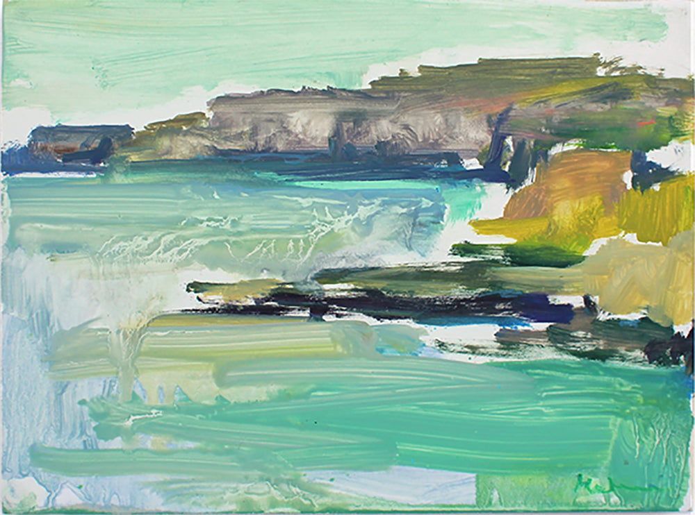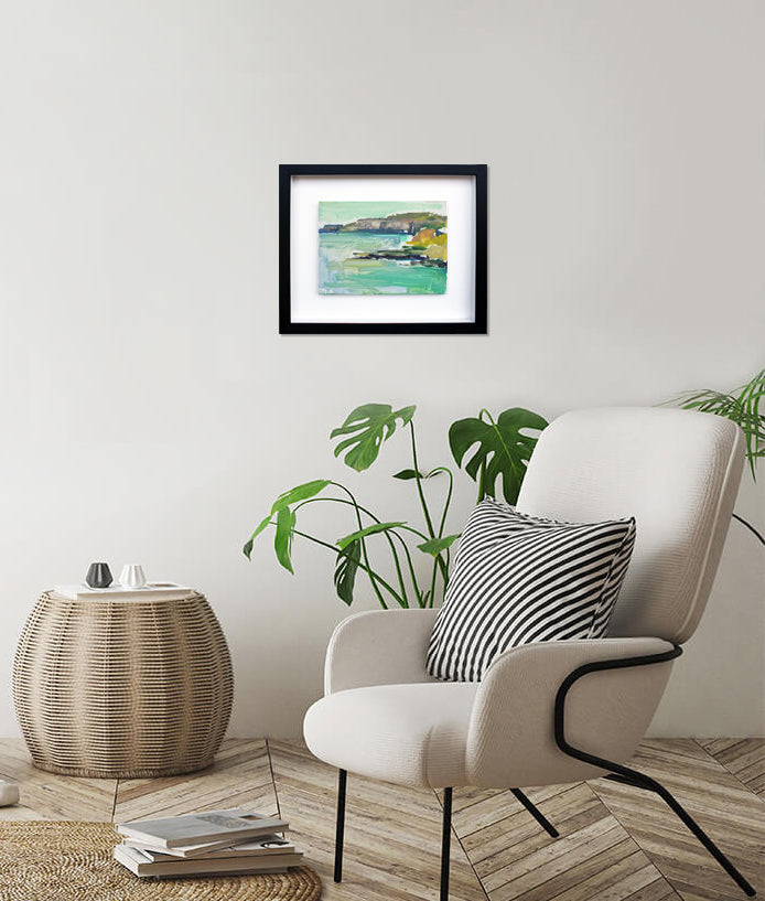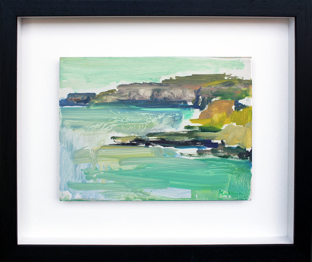 'Coastal Study Ballintoy' is a signed, oil painting on wood by Elaine Murdock framed in a black wooden tray frame.