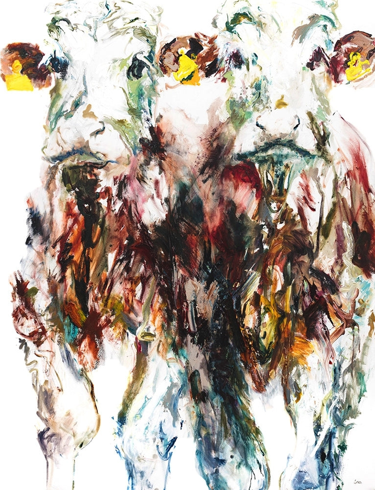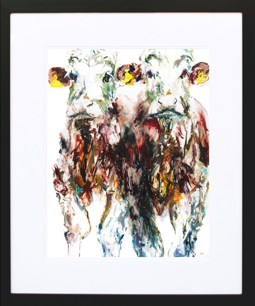 'Copper Companions' is a signed, limited edition print by Una O'Grady. In this 'Bovine' series of prints, the individual personalities of these wonderful creatures are on show. Their idiosyncratic movements and poses are captured as Una continues to approach her subject matter with a sensitivity, insight and vigour.