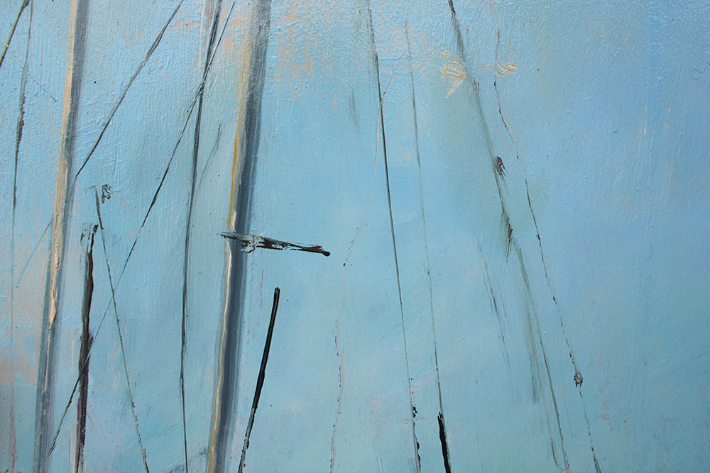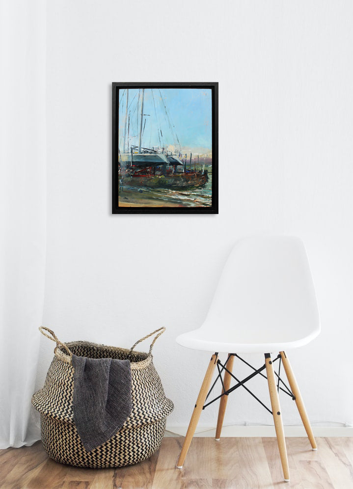 'Cultra Boatyard in January' is a signed, original, oil painting on board by Ed Reynolds.