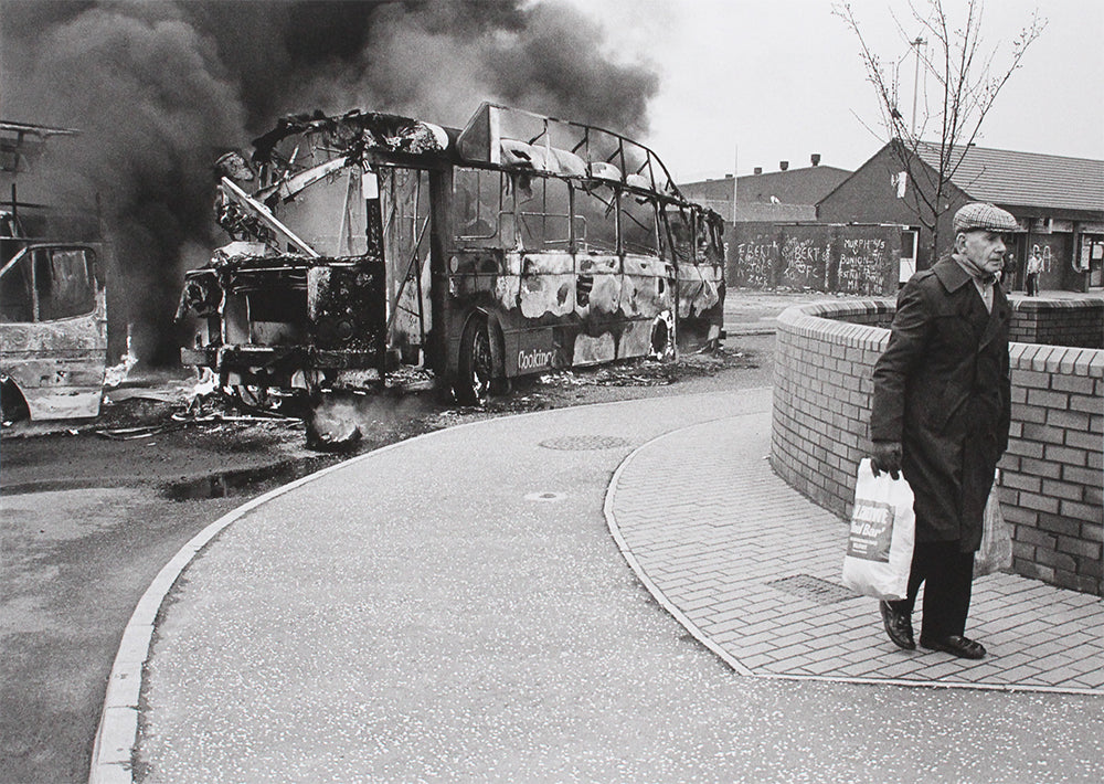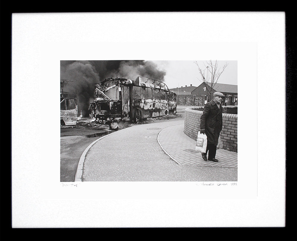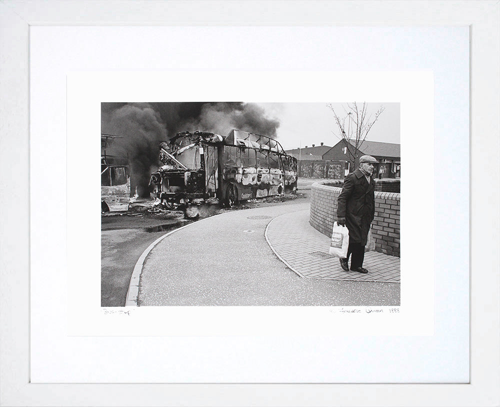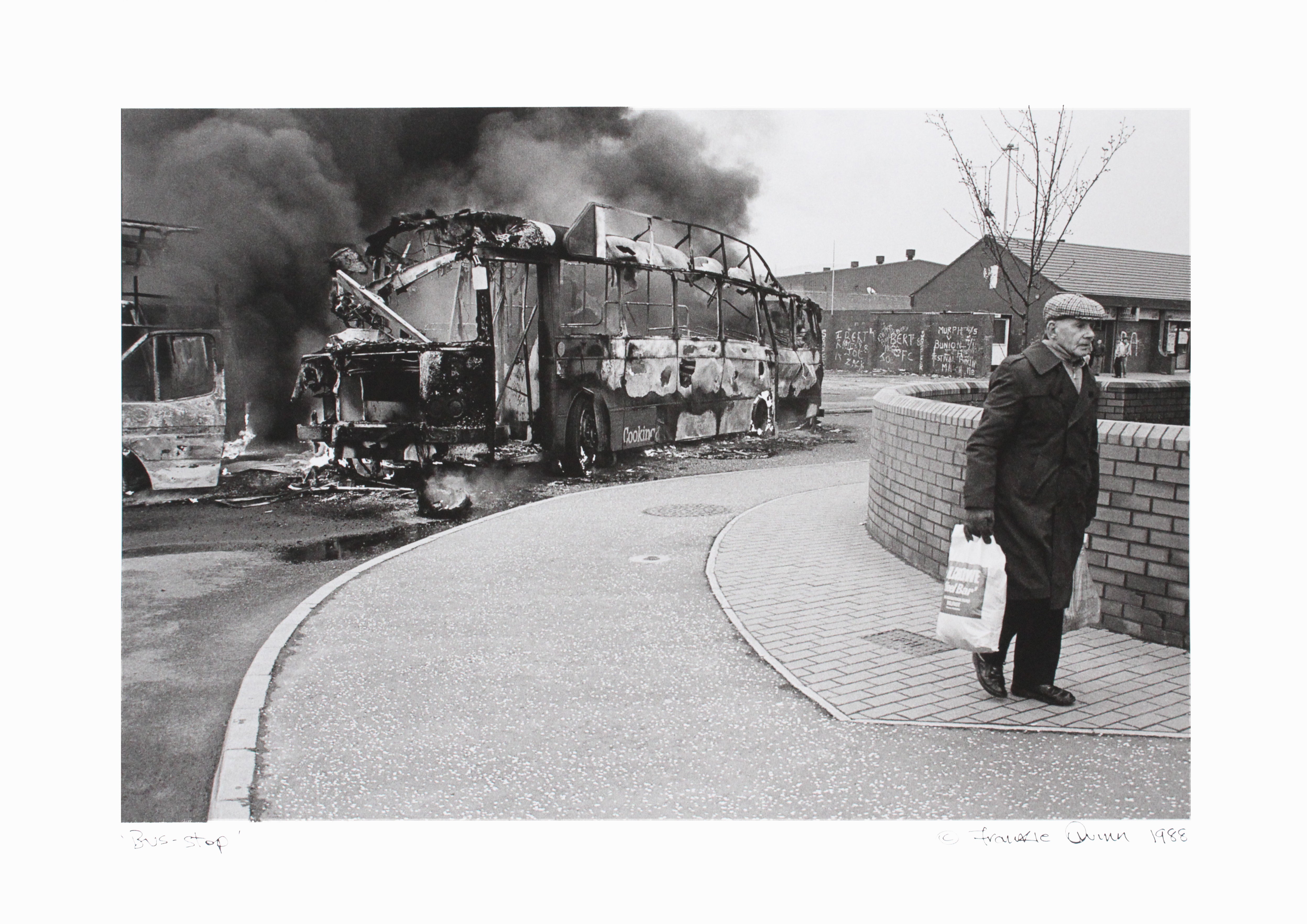 'Bus Stop' is a signed and titled photographic print by Frankie Quinn. This iconic print defined a generation of children growing up in inner city Belfast during 'The Troubles'.
