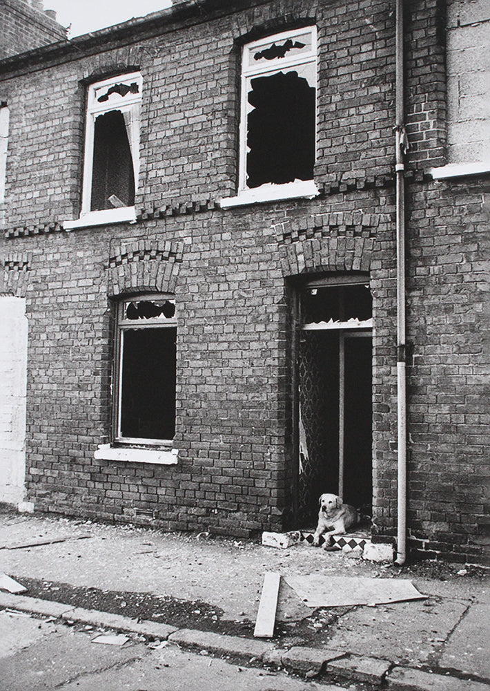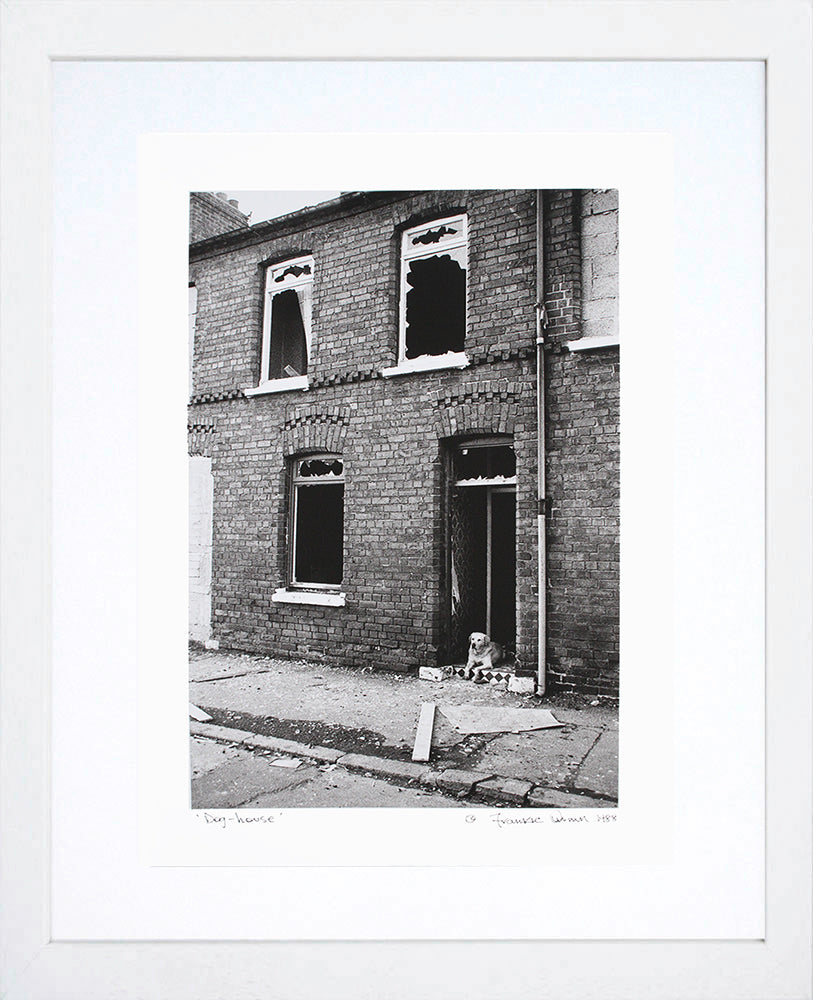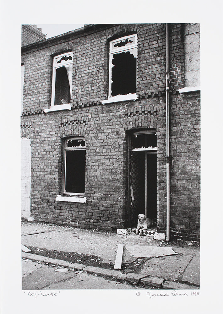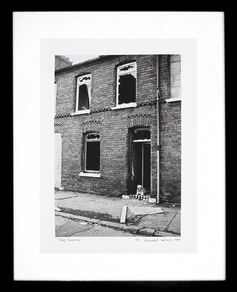 'Dog House 1988' is a signed and titled photographic print by Frankie Quinn, depicting a street in the Short Strand of his native Belfast.