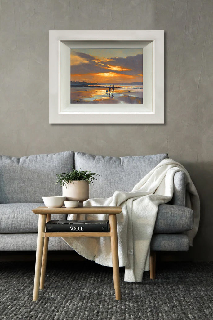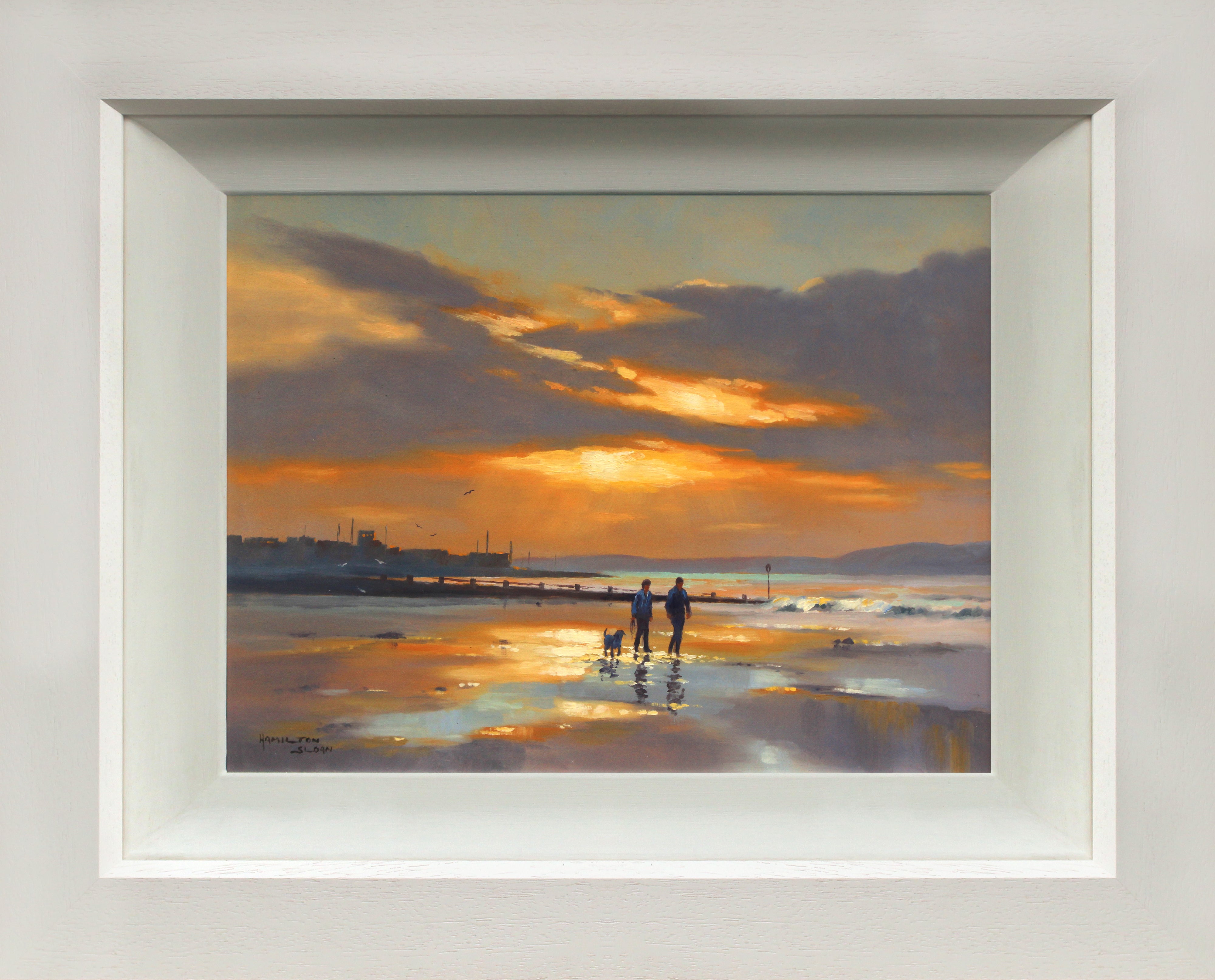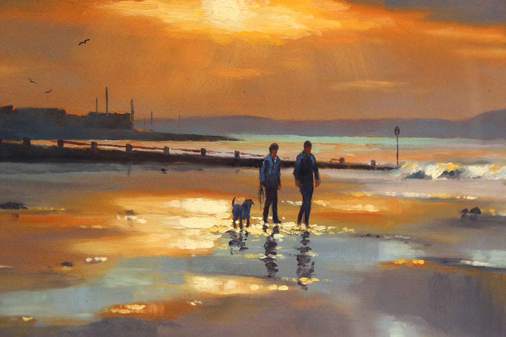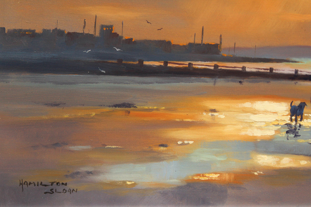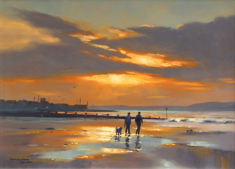 'Dog Walking At Ballyholme Beach' is a signed, original oil painting by Hamilton Sloan.