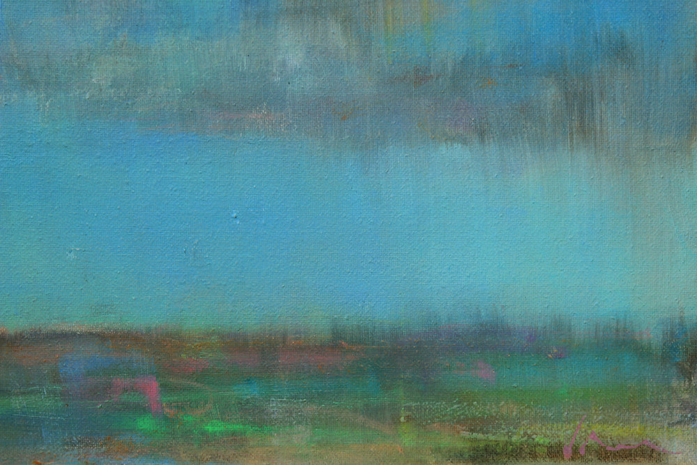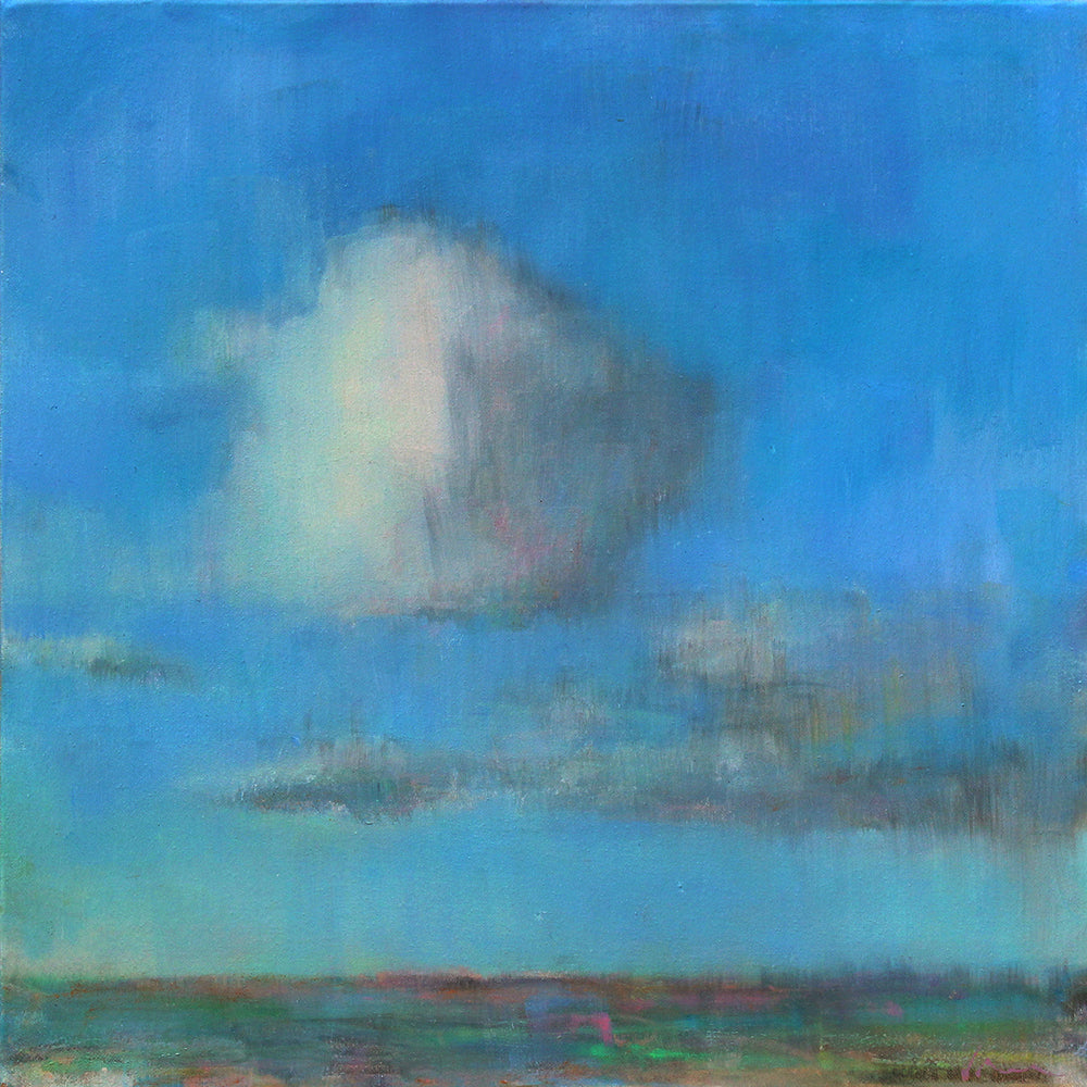 'Floating On A Cloud' is a signed, oil painting on wood by Elaine Murdock framed in an oak tray frame.