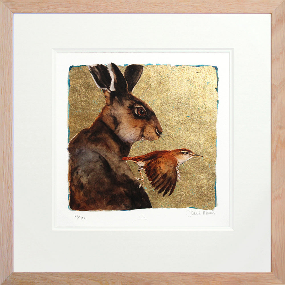 'Hare And Wren Artist Proof' is a limited edition giclee print of 195 signed by illustrator Jackie Morris. This print has hand applied 'gold' leaf and is printed onto 300gsm Canson Moulin du Roy 100% cotton rag paper It is presented in a double mount and comes with a Certificate of Authenticity.