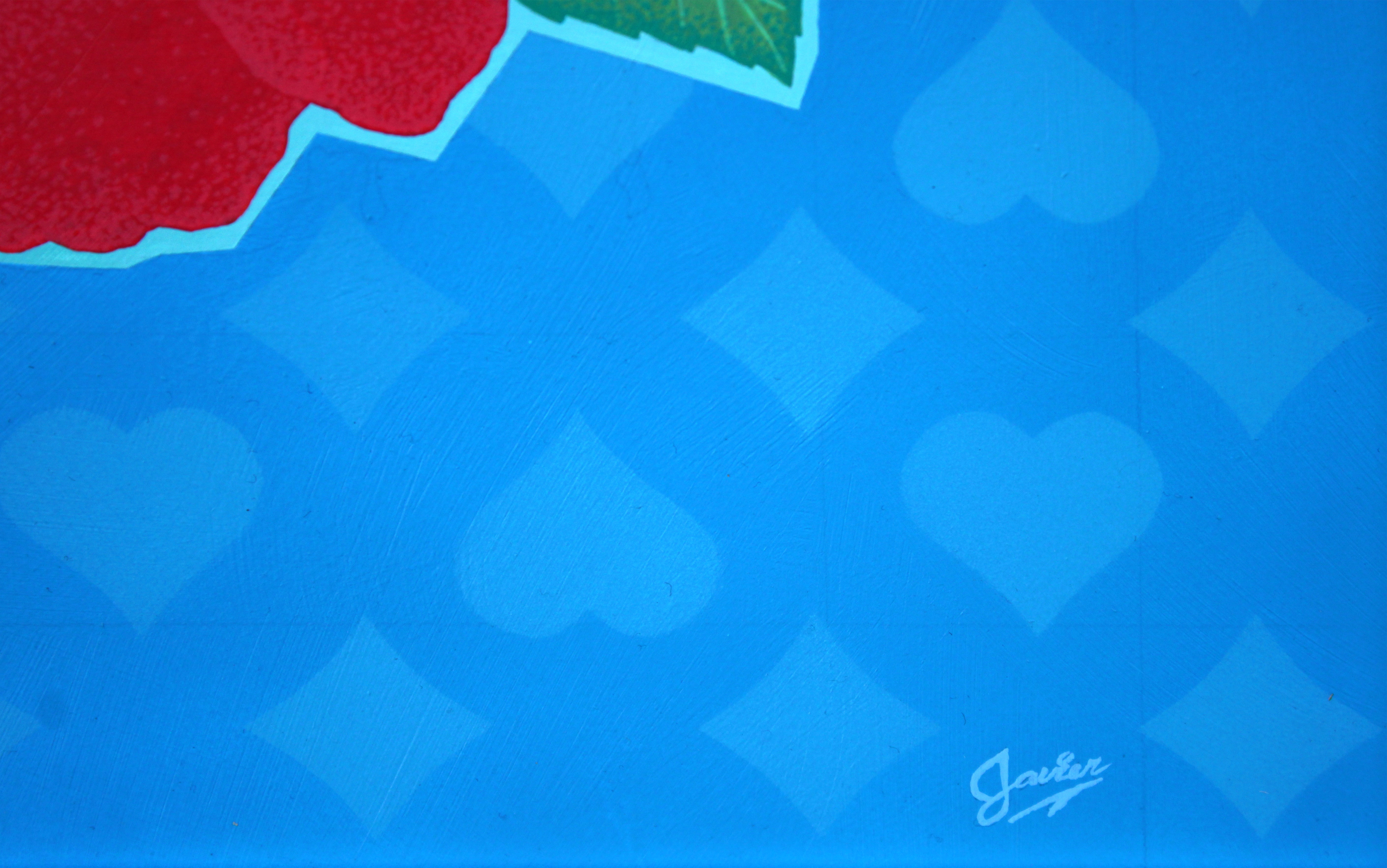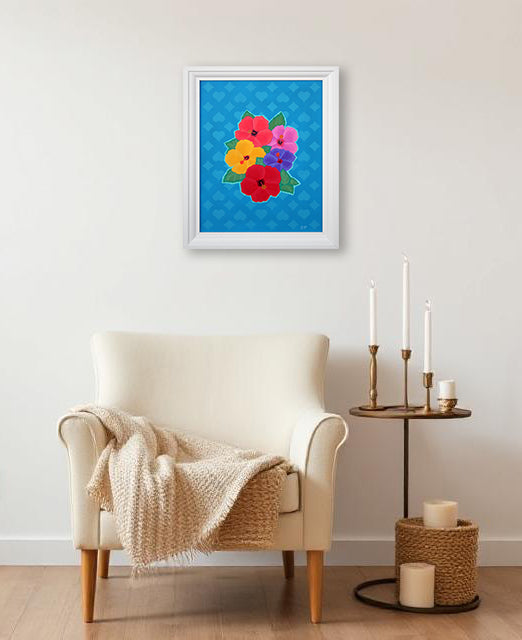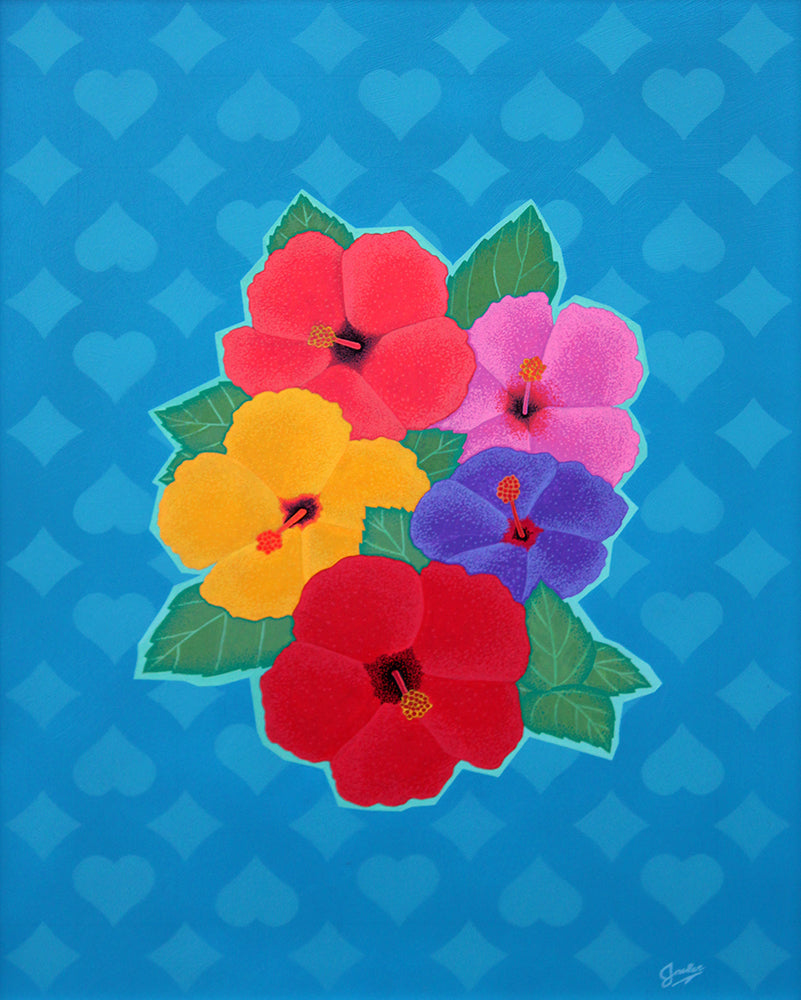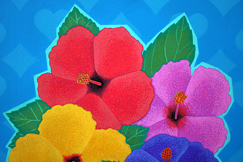 'Hibiscus Wonders' is a signed, original, acrylic painting on wood panel by Jeffery Javier.
