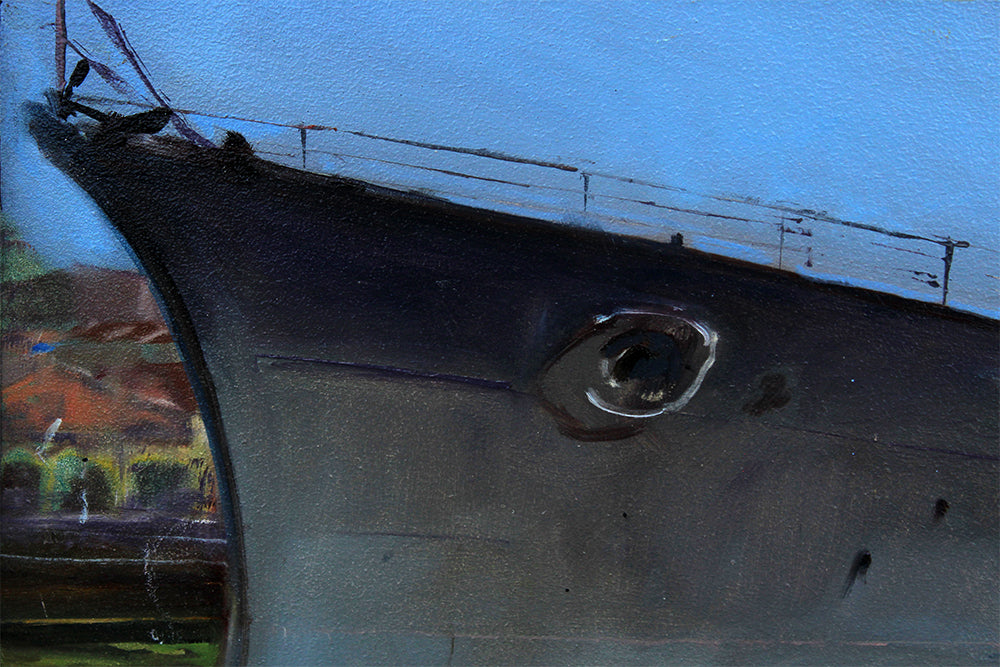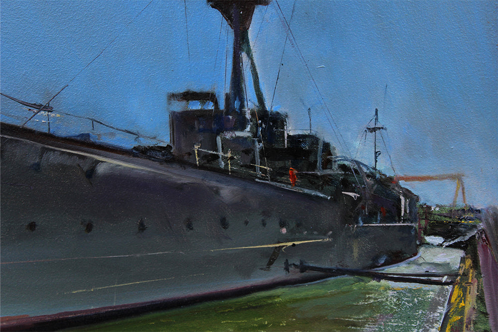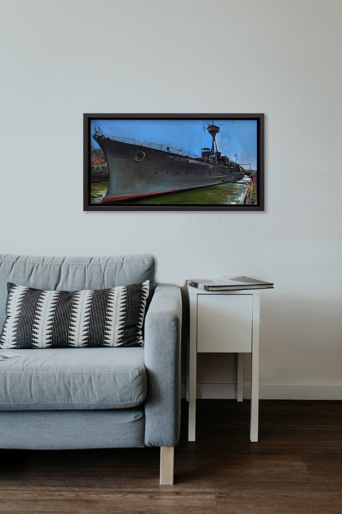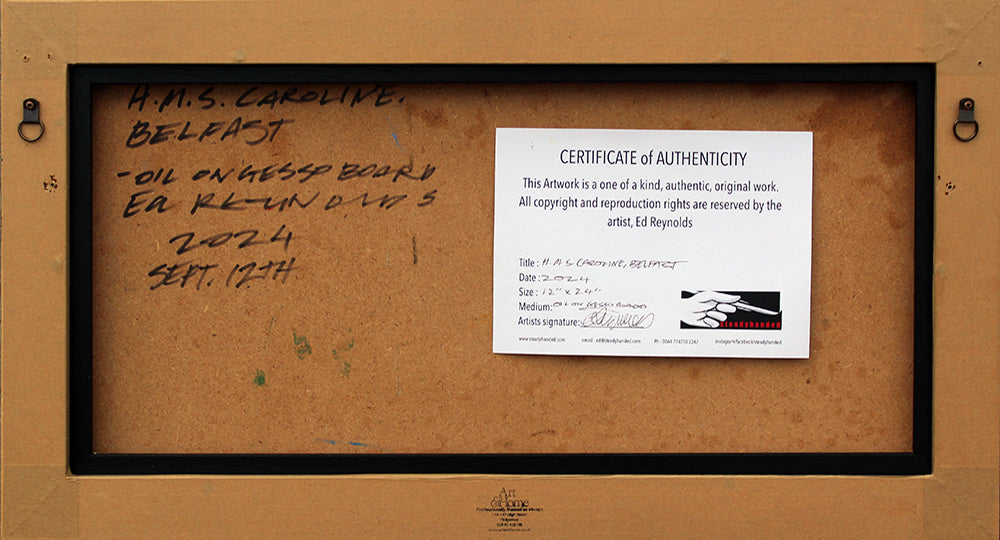 'HMS Caroline Belfast' is a signed, original, oil painting on board by Ed Reynolds.