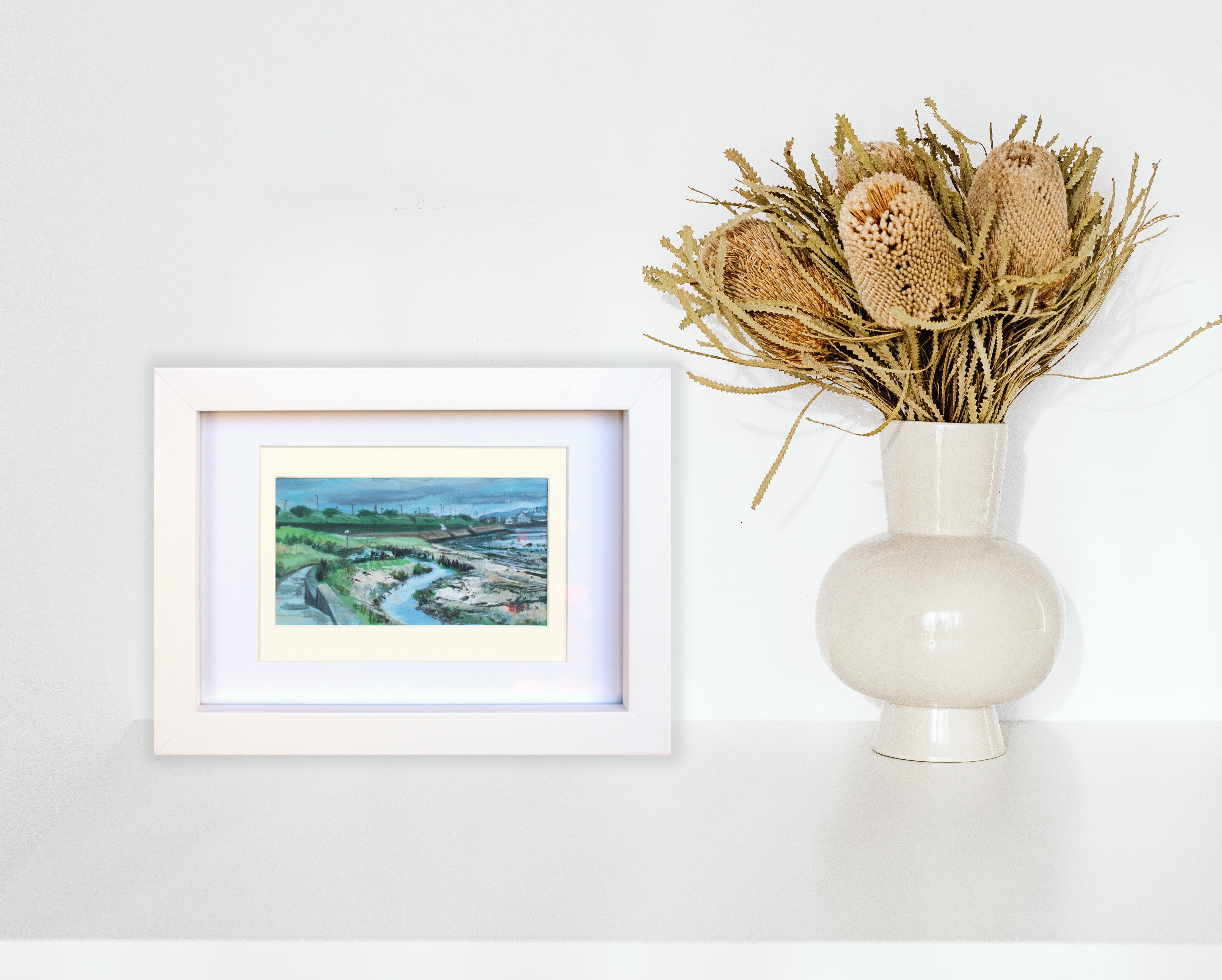This artwork comes in a white wooden frame with a double white mount.