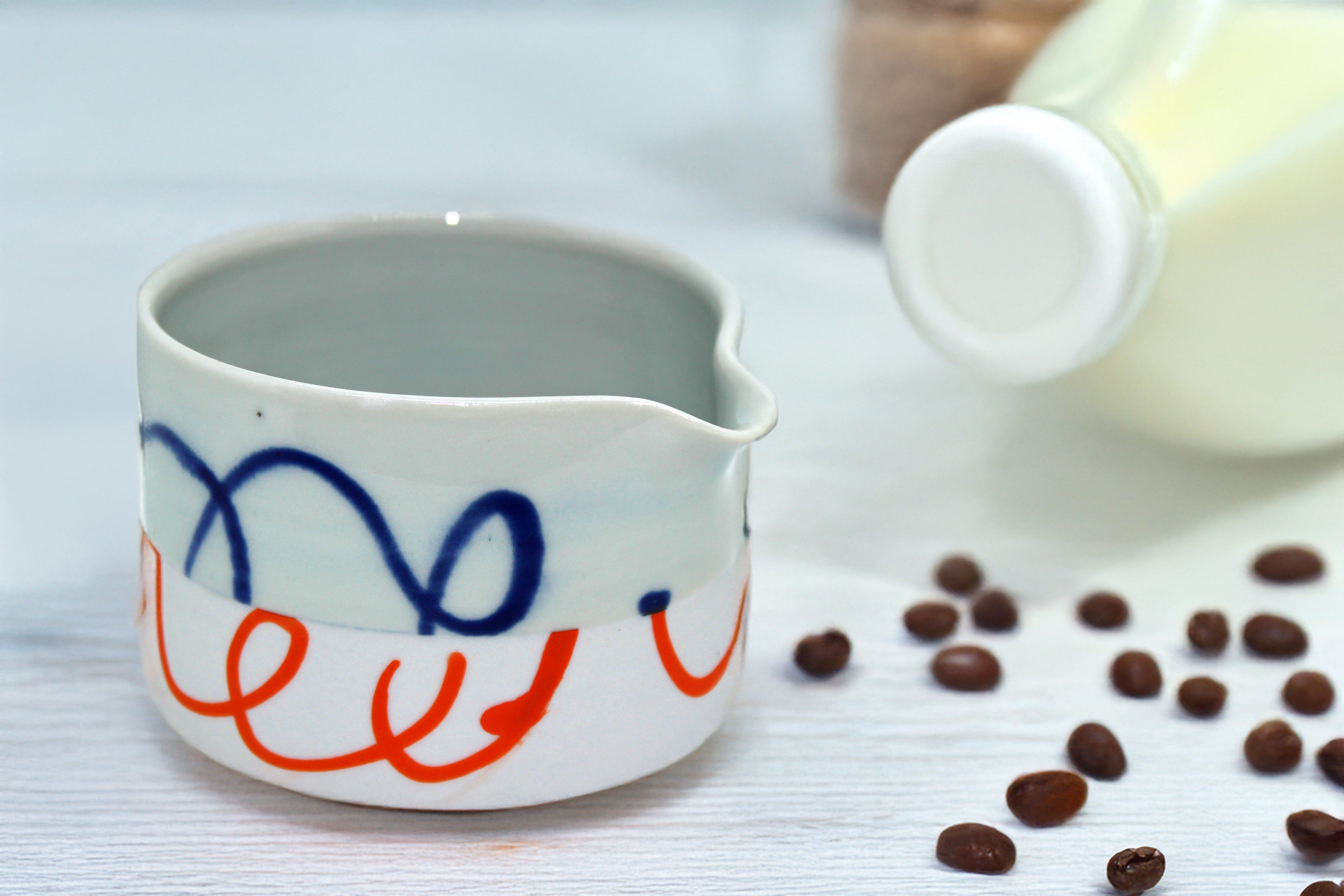 'Jug Creamer 5' is a beautifully hand crafted ceramic jug made from porcelain with a hand painted design. Adam Frew is a ceramicist from Northern Ireland who hand makes porcelain products using his spontaneity and personal expression.