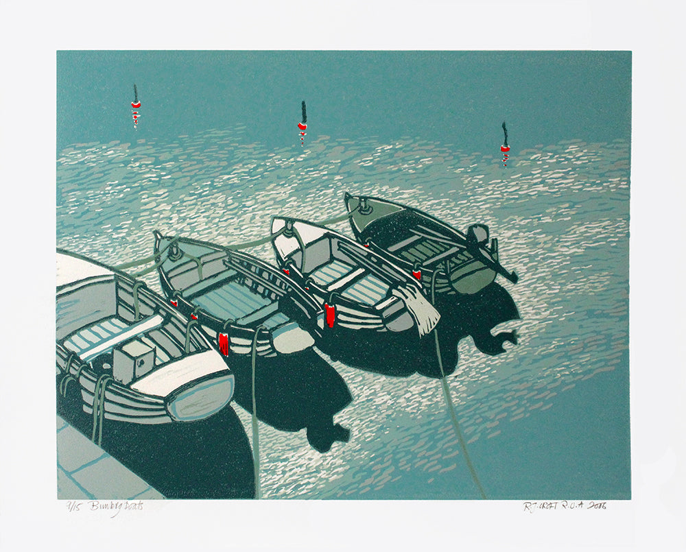 ‘Bunbeg Boats 2006’ is a signed, limited edition linocut print on paper by Richard Croft.