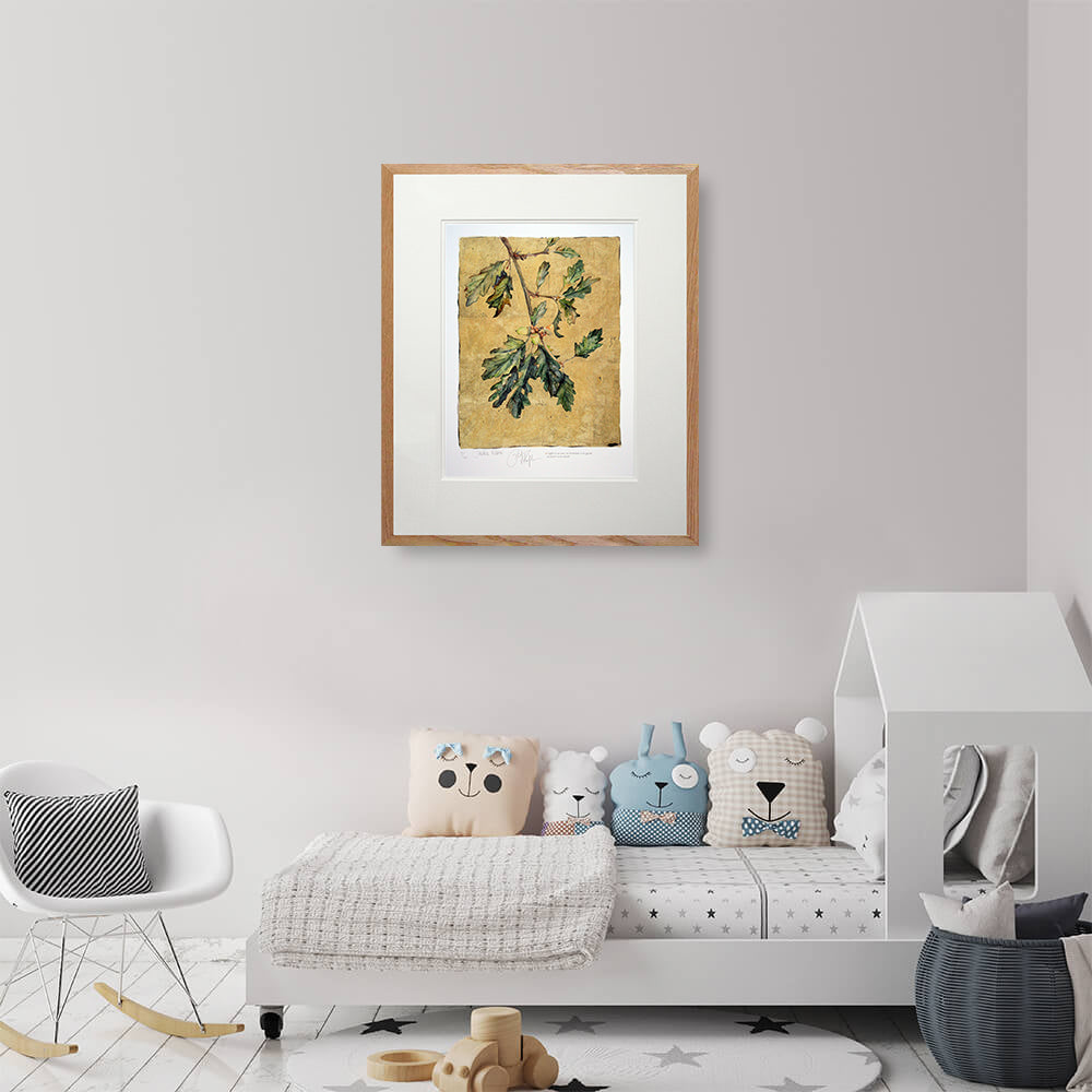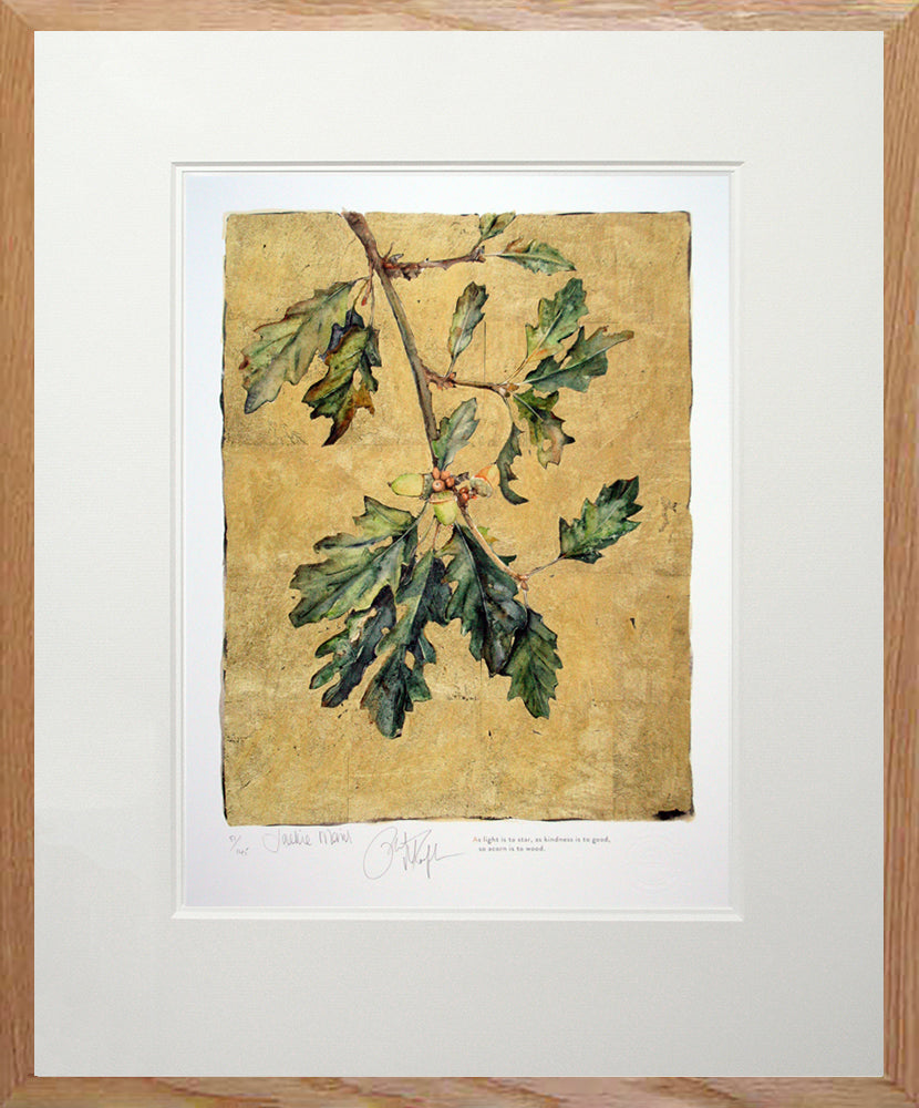 'Acorn' is a limited edition Giclee print of 145, from the book 'The Lost Words', signed by both the author Robert Macfarlane and illustrator Jackie Morris. Printed on 315gsm 100% cotton rag archival paper the print comes with a Certificate of Authenticity and is held in a white double mount.