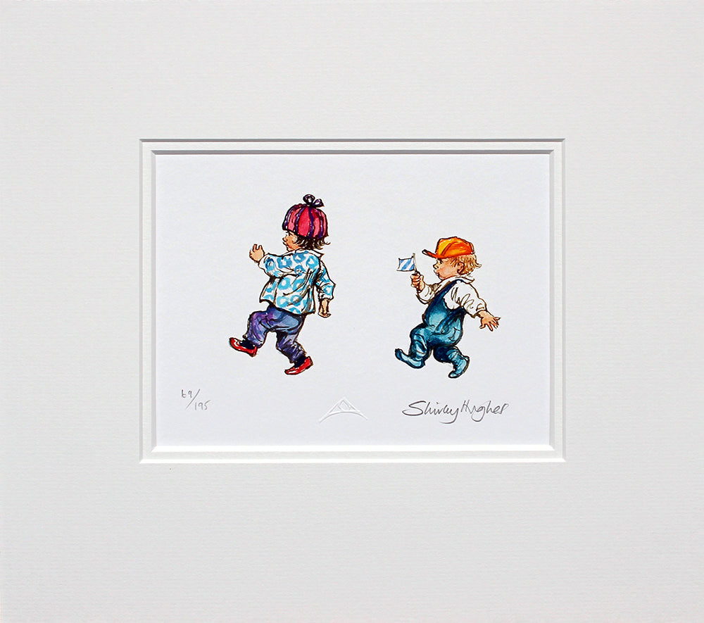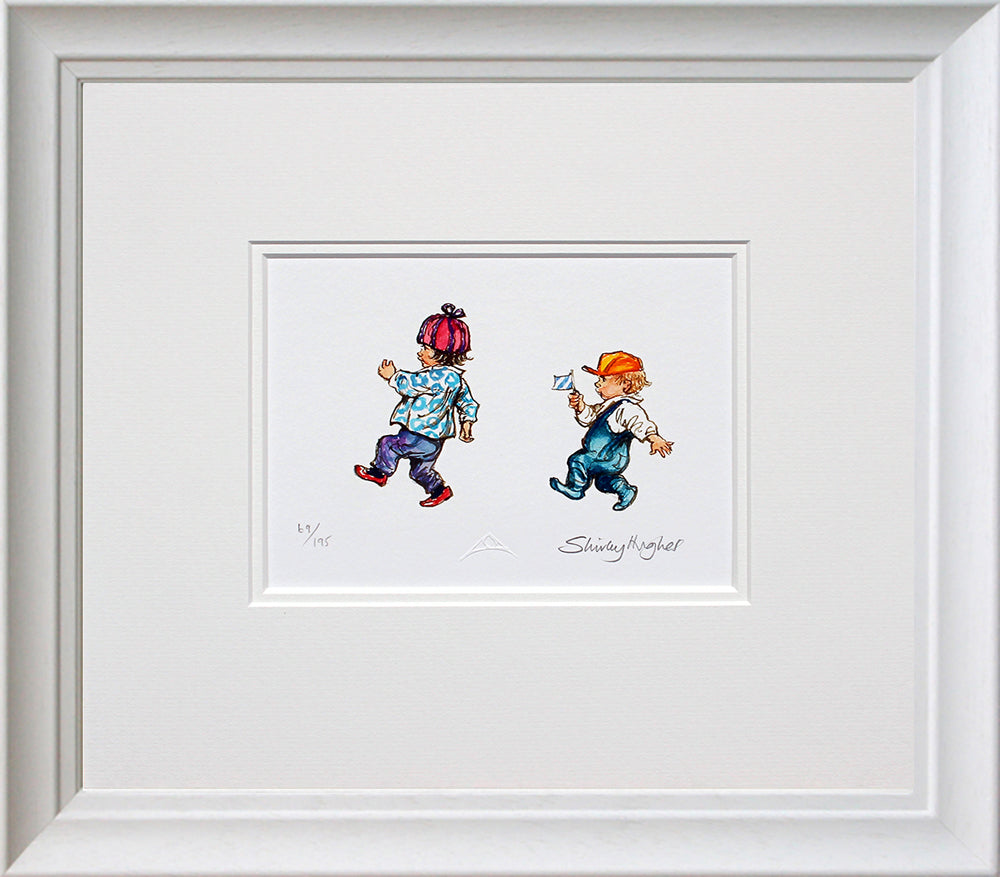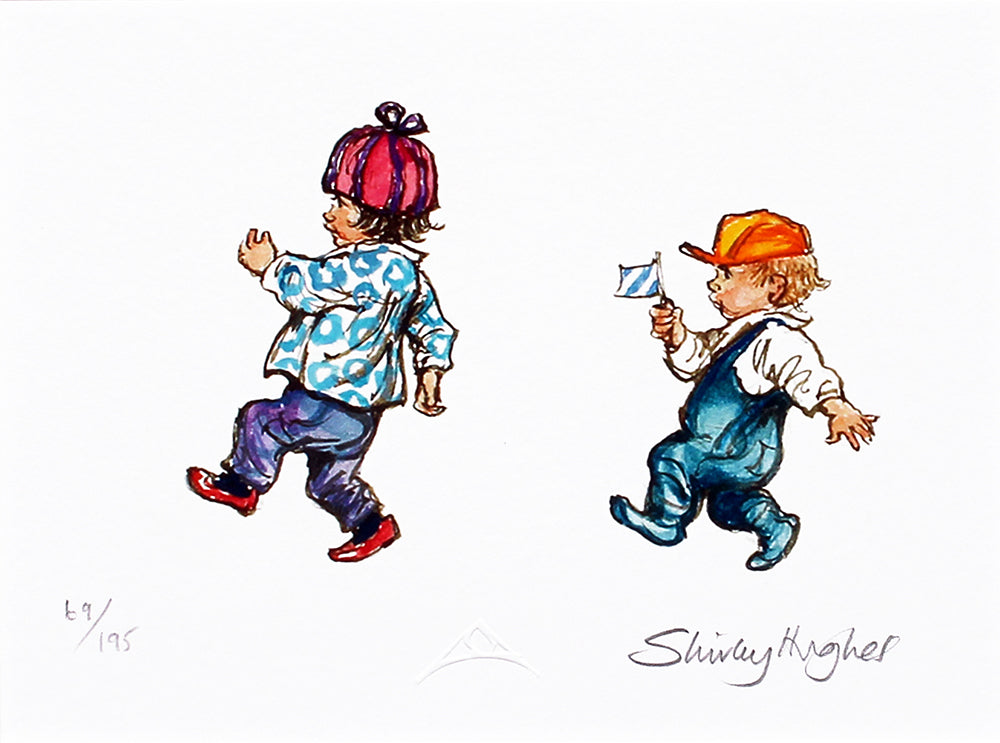 'Marching' is a signed, limited edition, giclee print by author and illustrator Shirley Hughes, the creator of the much loved "Alfie" children's books. This print was published in February 2010 by Aquarelle.