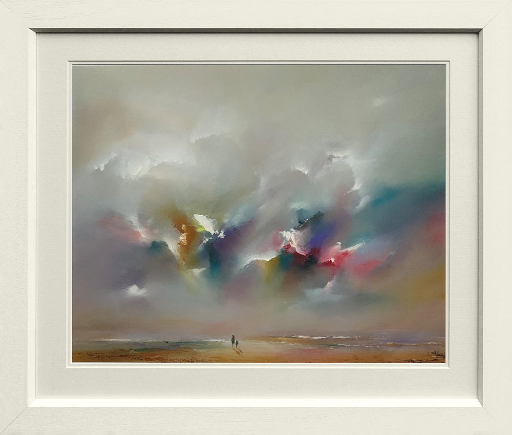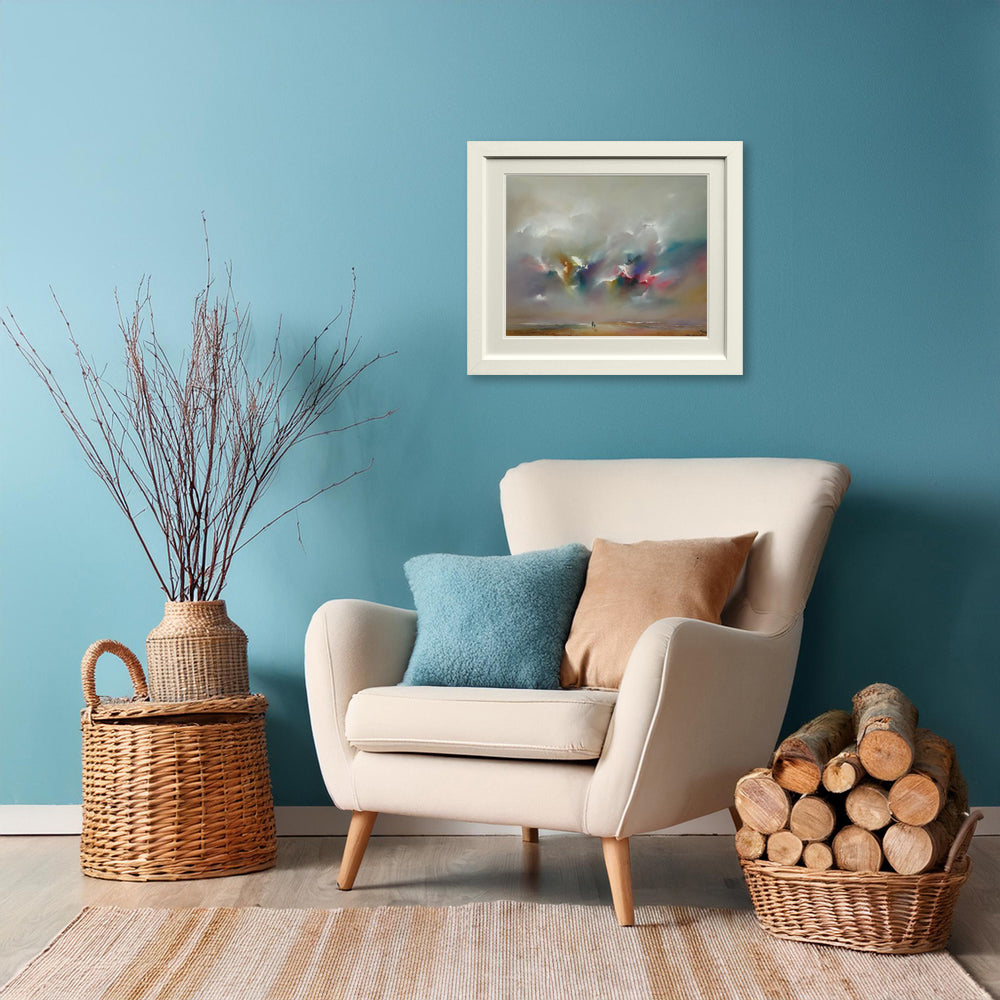 This artwork comes in a white, wooden frame with a white mount.