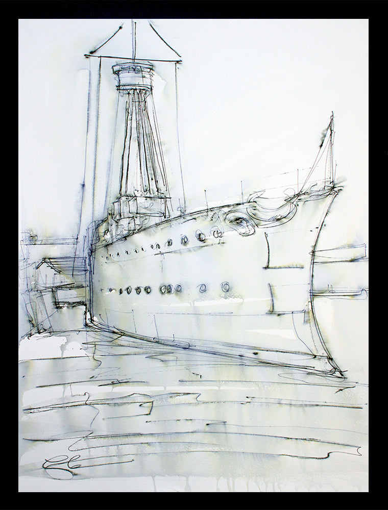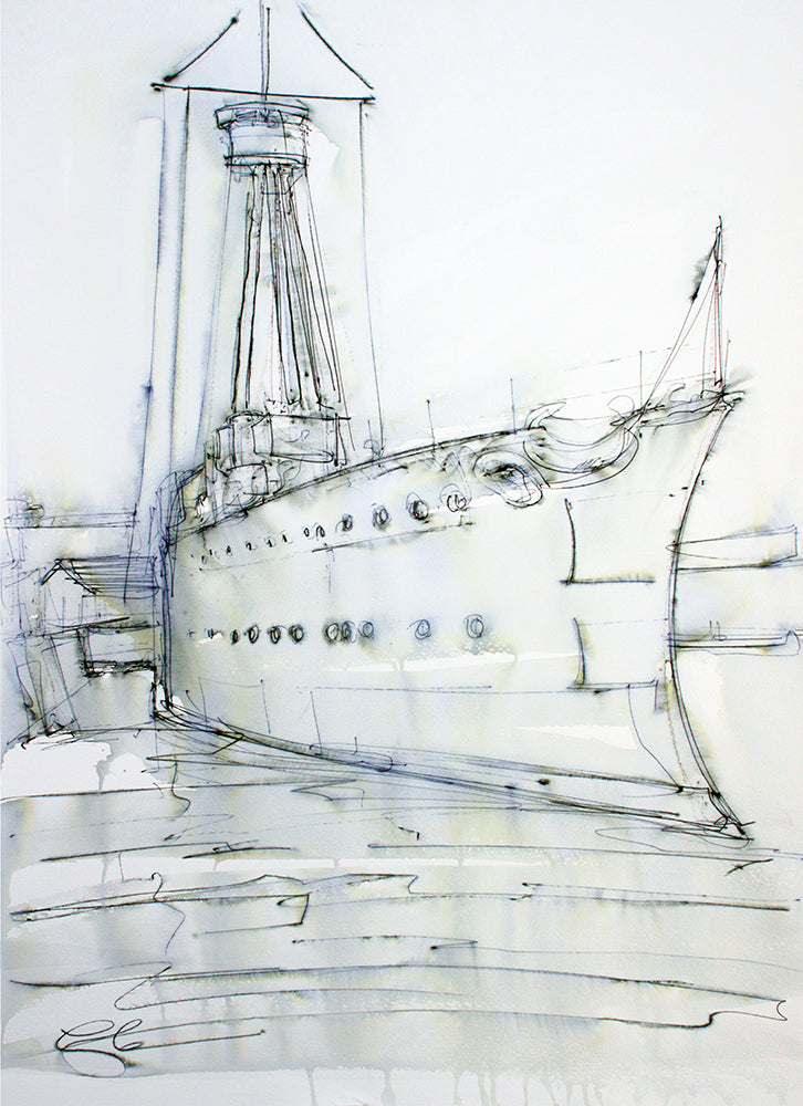 ‘HMS Caroline‘ is a signed, original mixed media painting on paper by Stephen McClean.