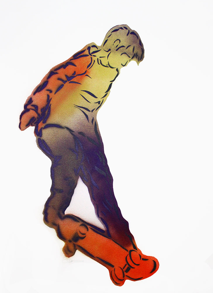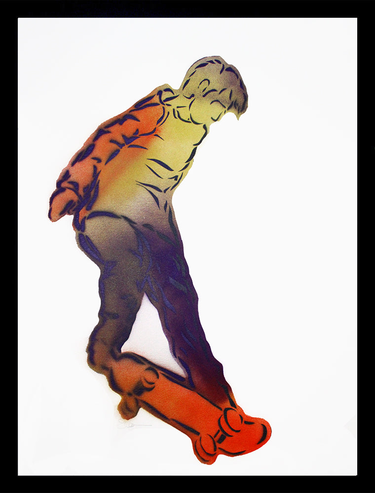 ‘On The Boards‘ is a signed, original spray paint artwork on paper by Stephen McClean.