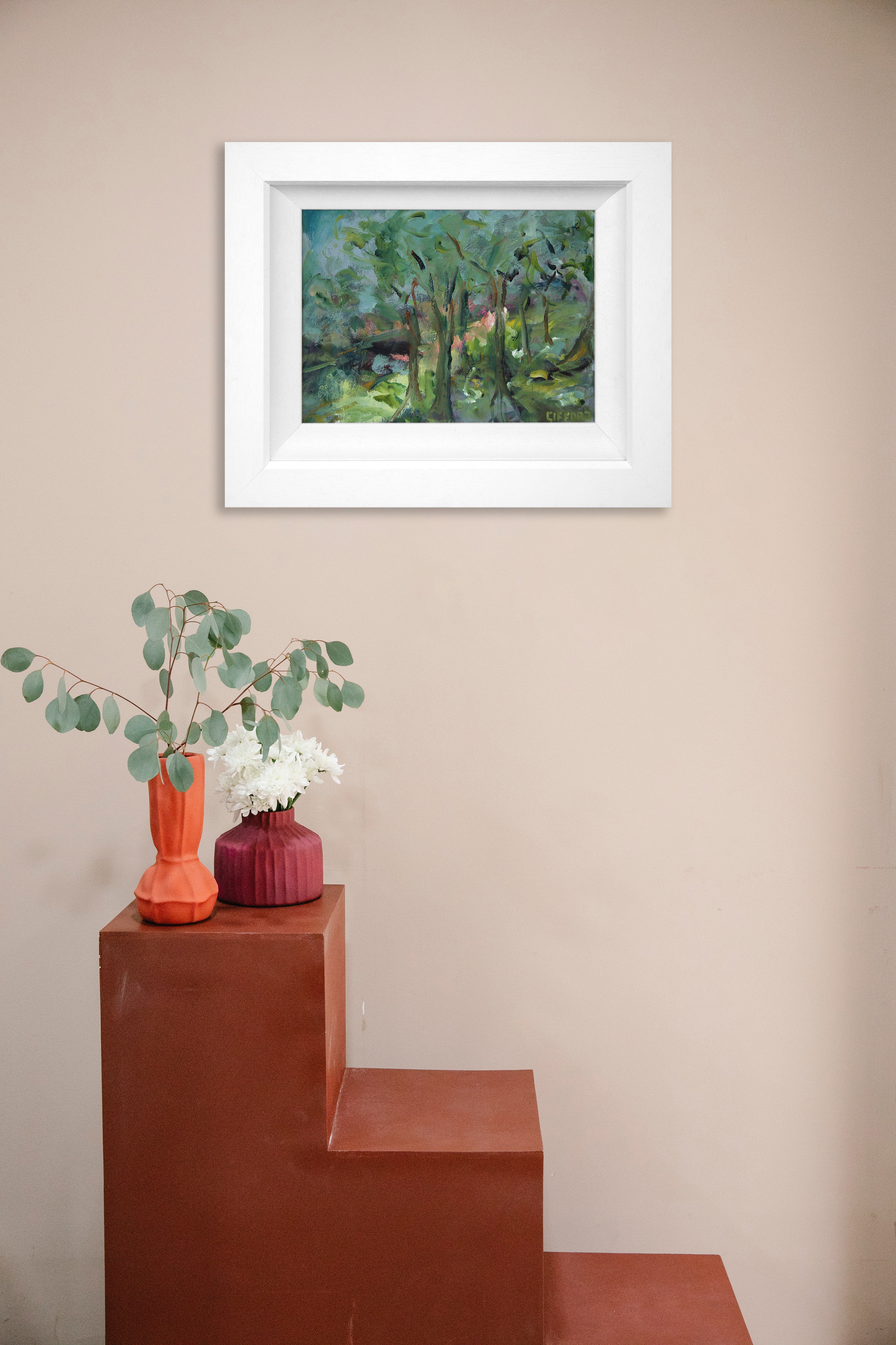 This artwork comes in a glazed, white, wooden chunky double frame.