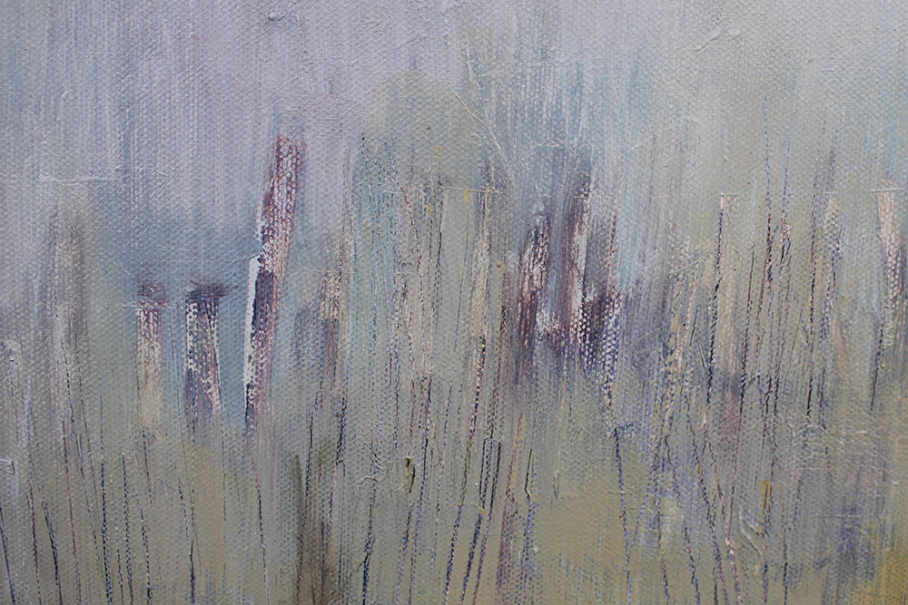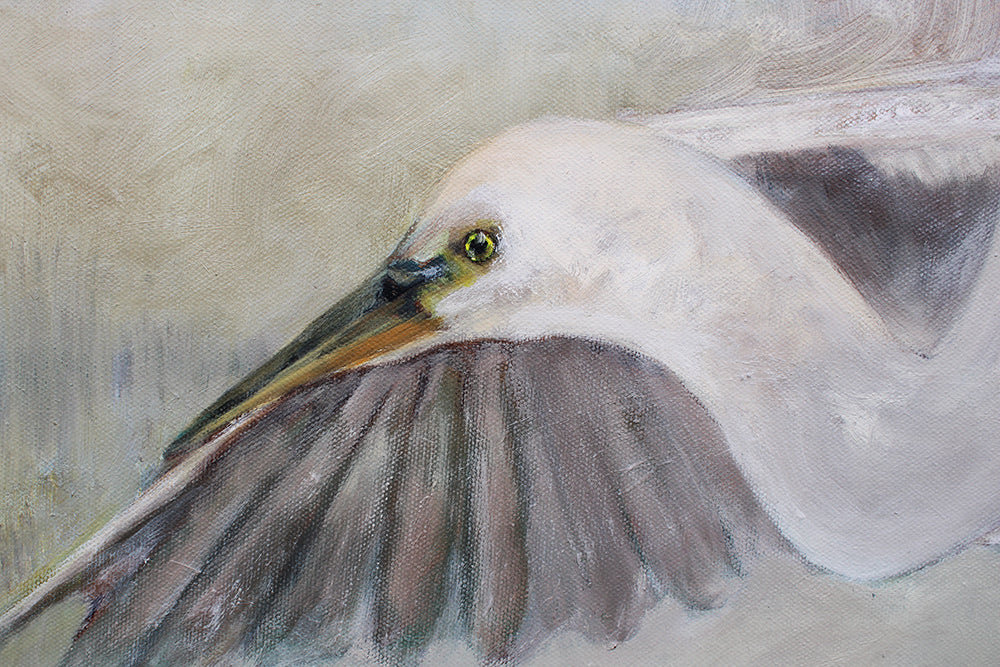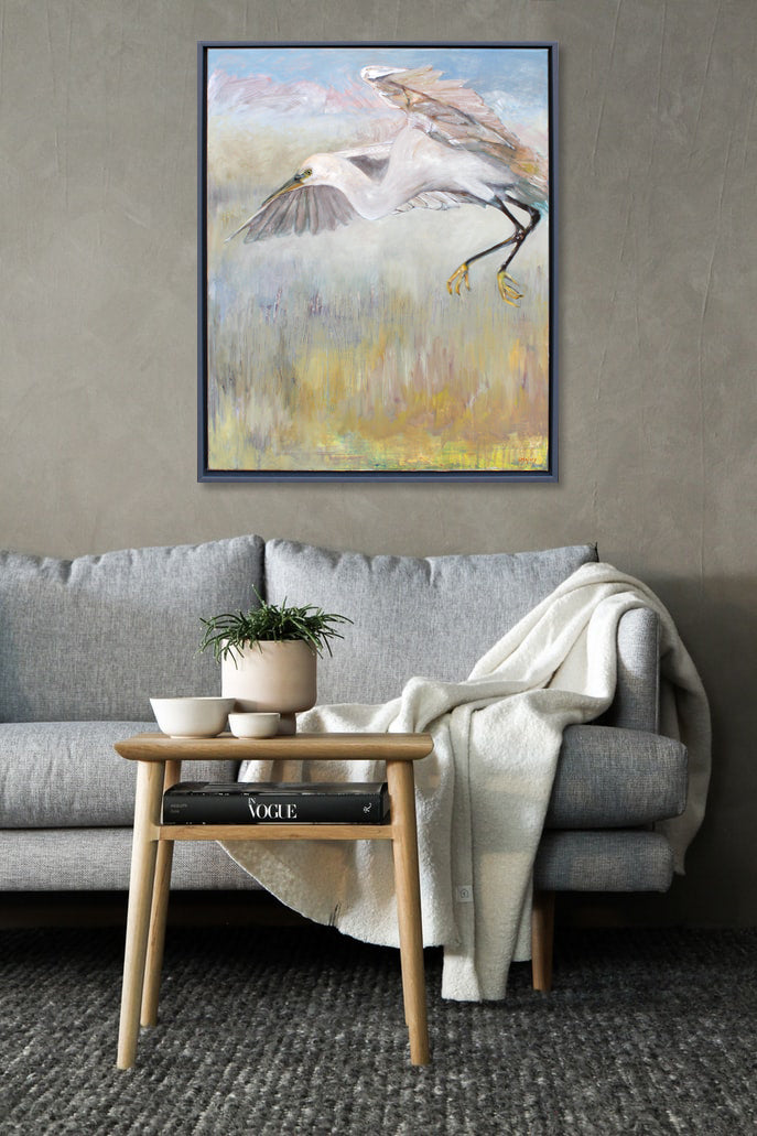 'Swoop' is a signed, oil painting on canvas by Sarah Majury framed in a blue wooden tray frame.