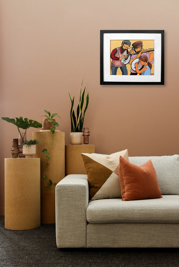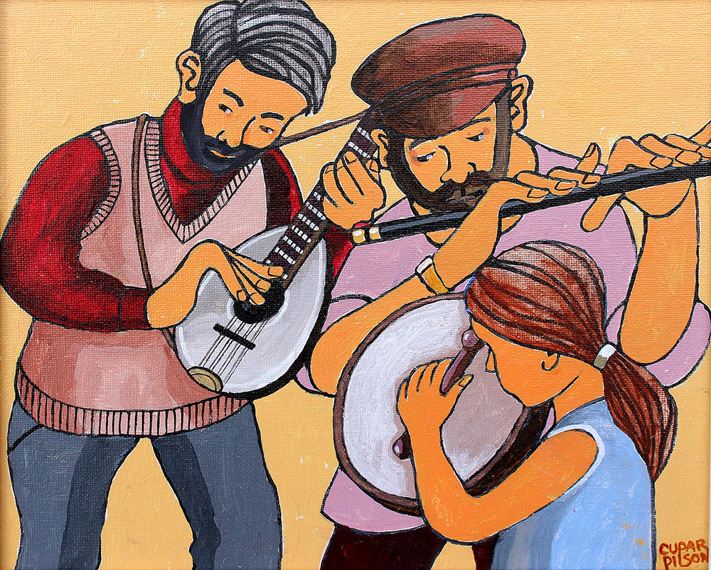 'Three Musicians' is a signed, original, acrylic and oil painting by Cupar Pilson.