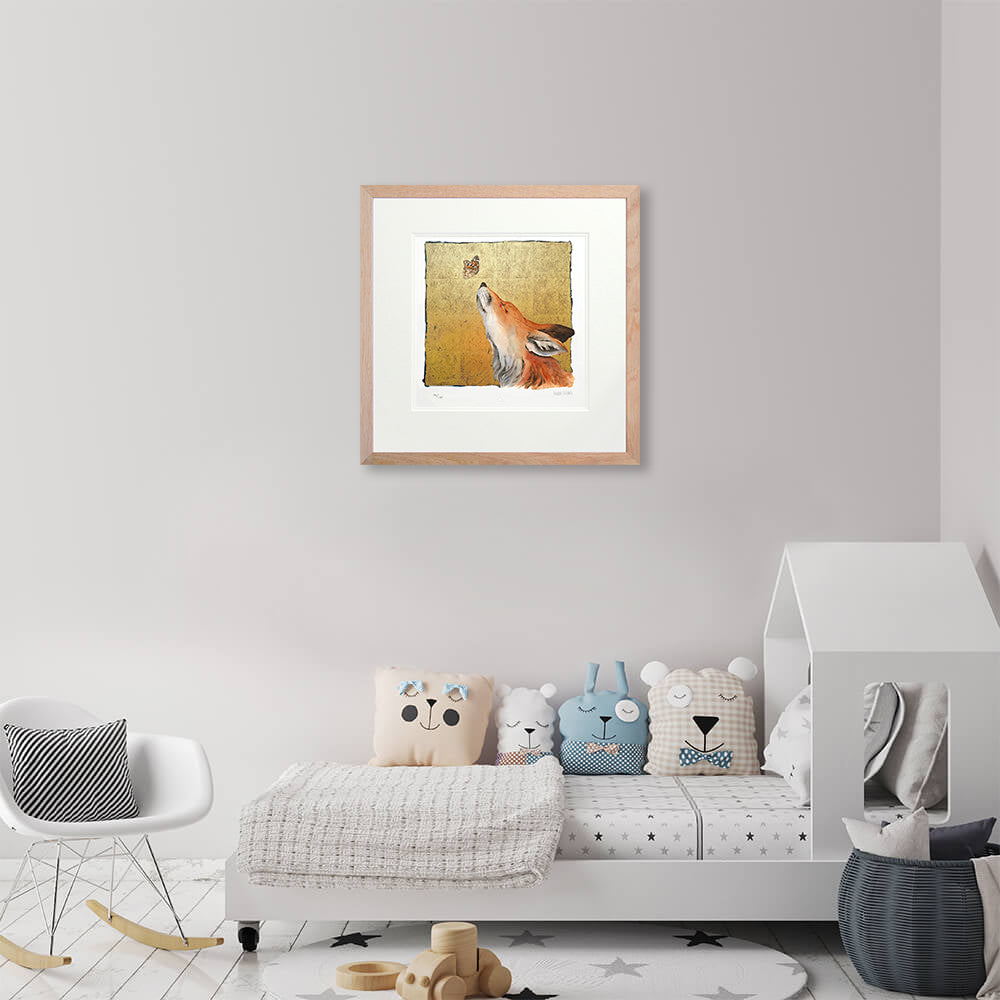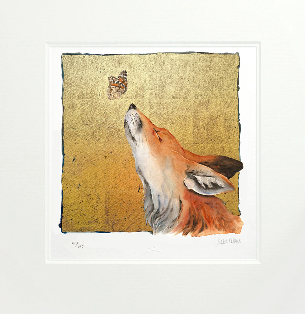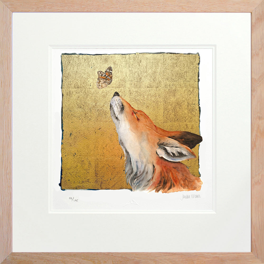 'Fox And The Painted Lady' is a limited edition Giclee print of 195 signed by illustrator Jackie Morris. This print has hand applied 'gold' leaf and is printed onto 300gsm Canson Moulin du Roy 100% cotton rag paper It is presented in a double mount and comes with a Certificate of Authenticity.