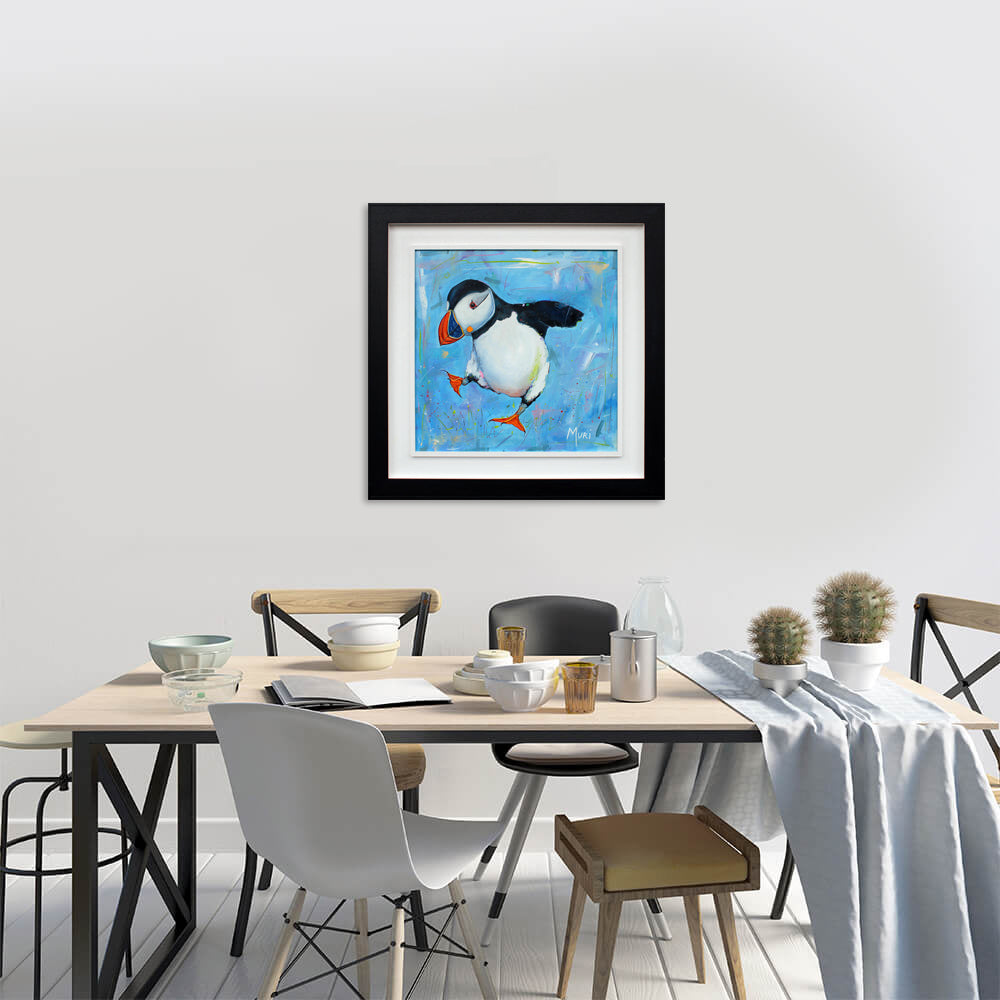 This painting comes in a black bevelled double frame with a white, wooden inner frame.