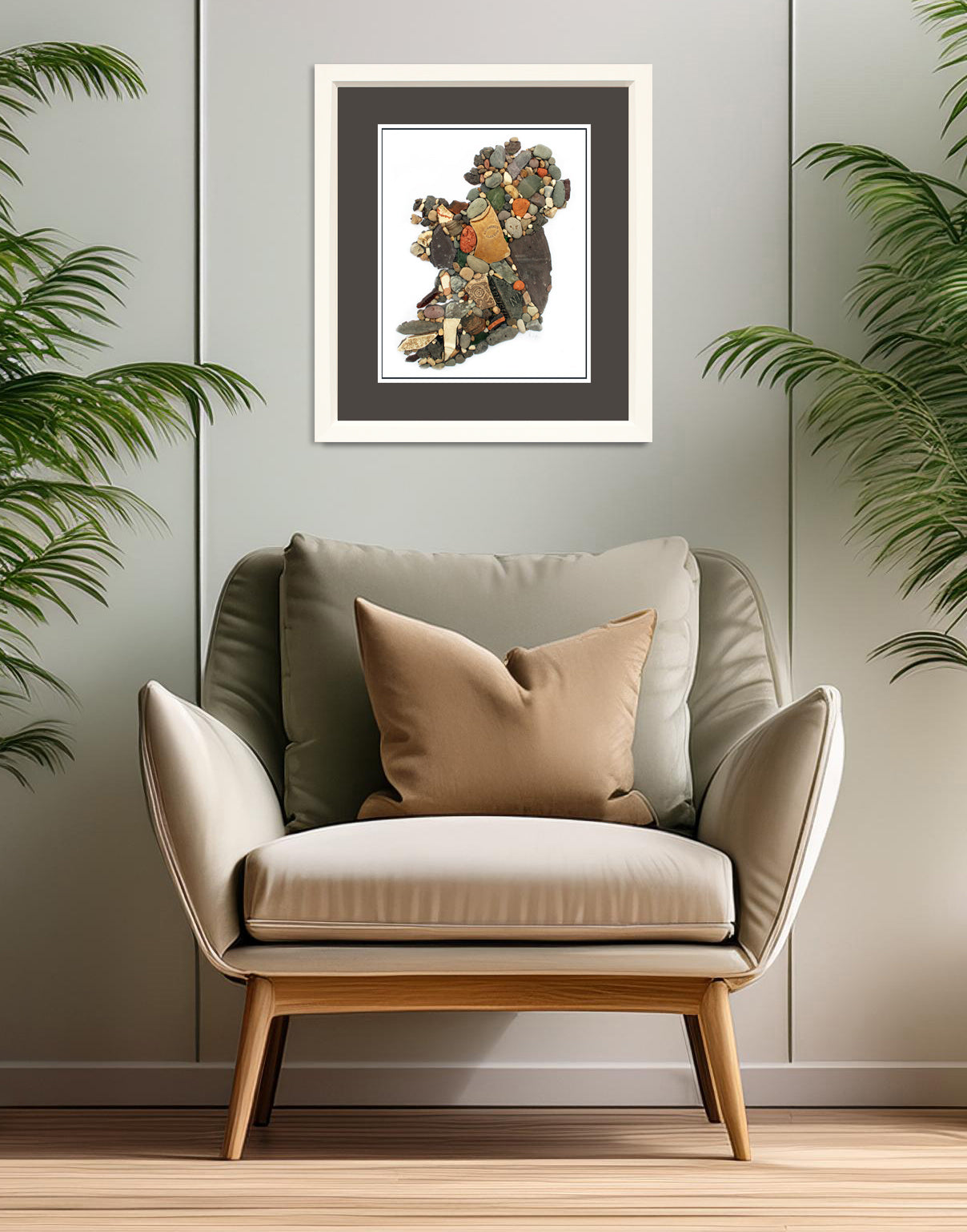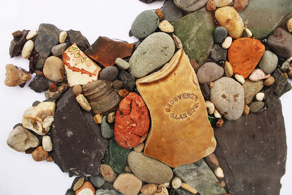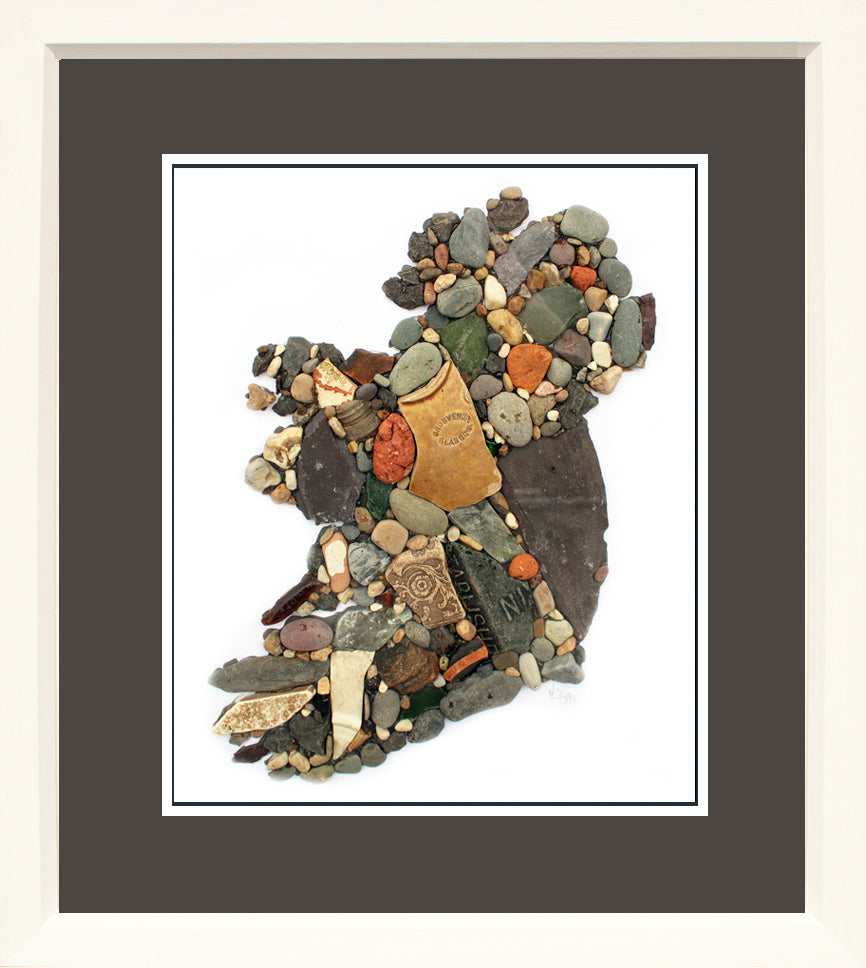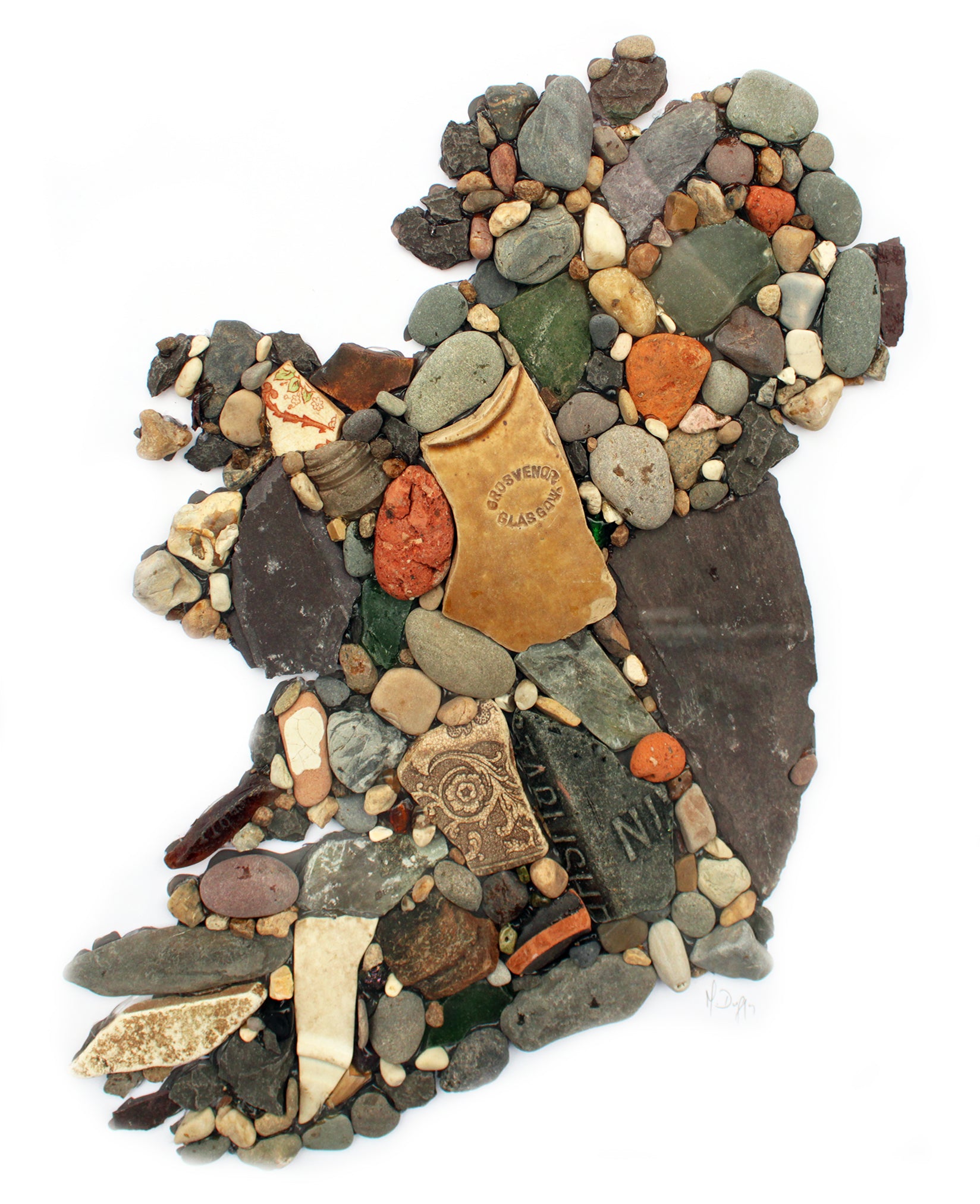 'Pebble Ireland 2' is a signed, original sculptural artwork by Michelle Duffy. This sculpture is made from collected sea glass and broken pottery from Lough Merlin and pebbles from beaches around Ireland.