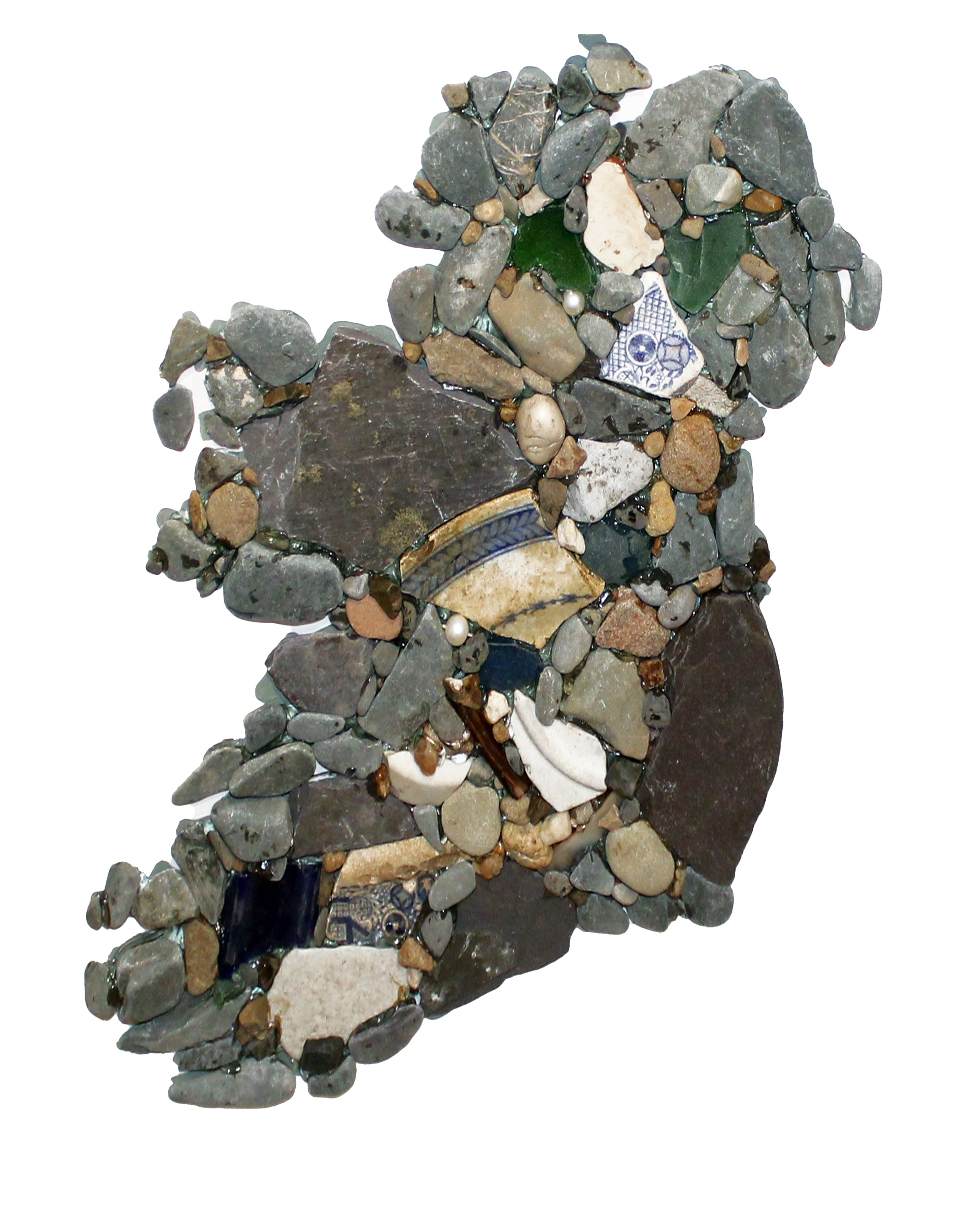 'Pebble Ireland 3' is a signed, original sculptural artwork by Michelle Duffy. This sculpture is made from collected sea glass and broken pottery from Lough Merlin and pebbles from beaches around Ireland.