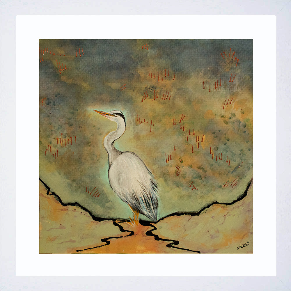 'Heron at the Marina' is an open edition giclee fine art print by Gail Rider.