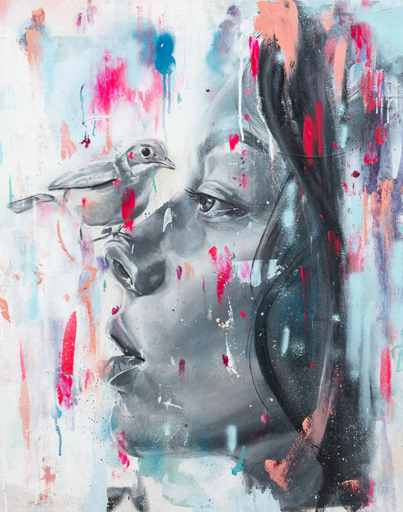 "In "Little Bird," a tender moment unfolds as a woman balances a small bird on her nose, symbolizing the delicate bond of motherhood. The interplay of soft lines and vibrant colours captures a sense of nurturing and joy, while the bird embodies innocence and care. This whimsical yet poignant piece invites viewers to reflect on the beauty of maternal love and the quiet moments that define the journey of raising a child. Through this enchanting imagery, "Little Bird" celebrates the profound connection between a mother and her child, highlighting the joy and responsibility of nurturing life."