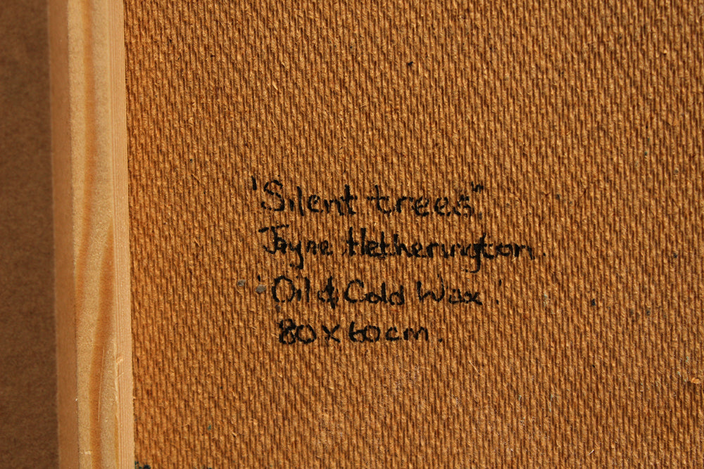 'Silent Trees' is a signed, oil and cold wax on panel painting by Jayne Hetherington.