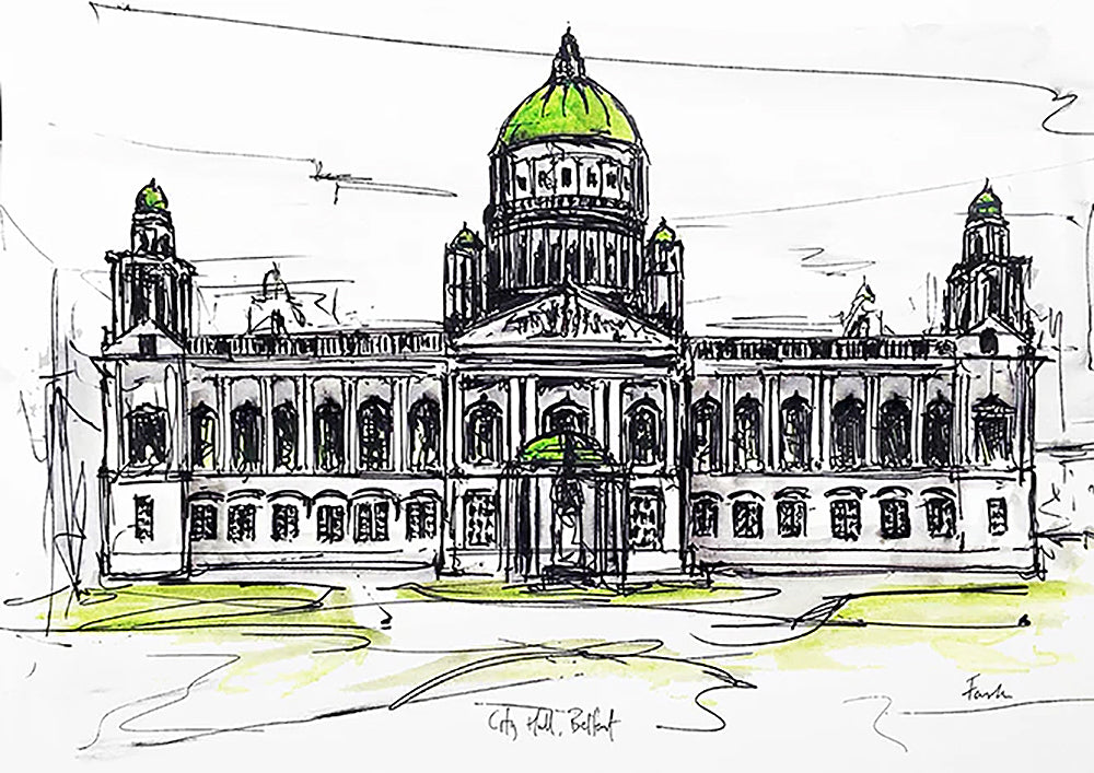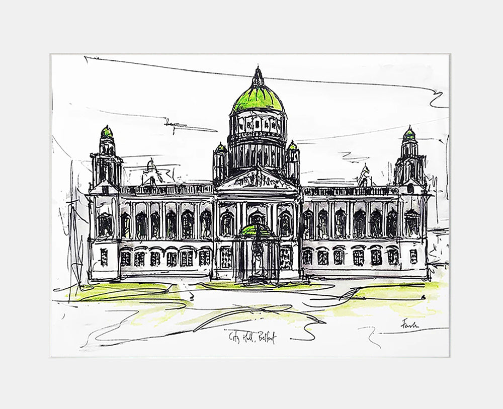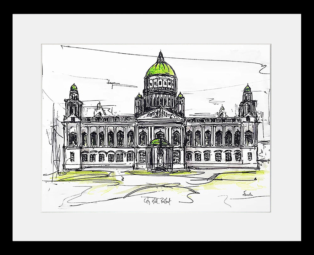 'City Hall, Belfast' by Stephen Farnan is a digitally signed, open edition print presented in a white single mount.