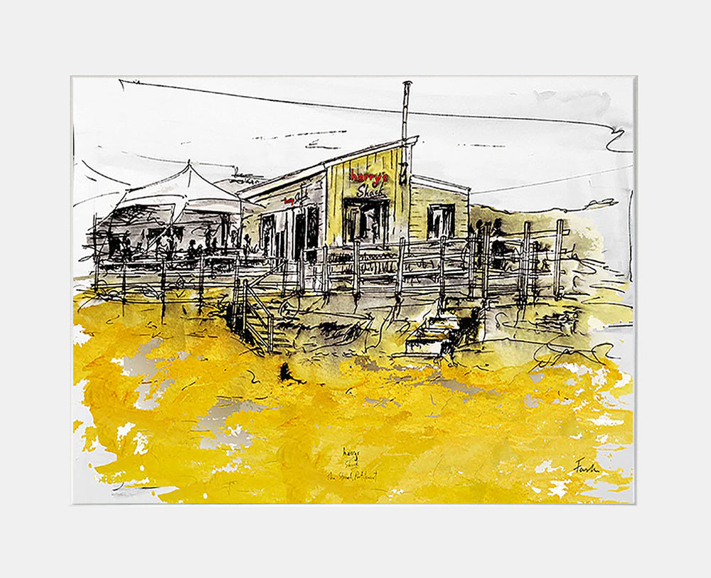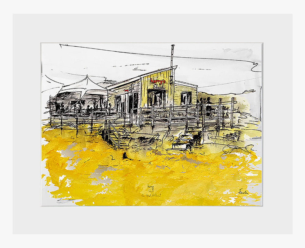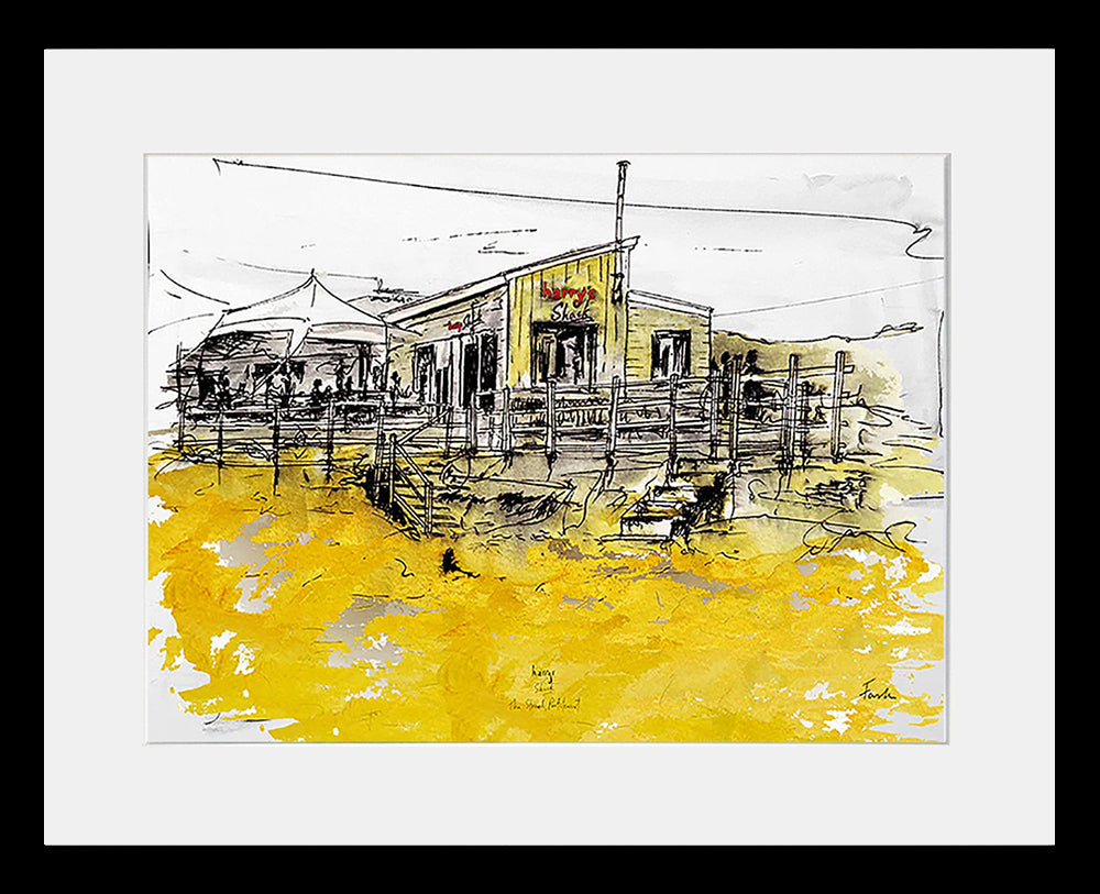 'Harry's Shack, The Strand, Portstewart' by Stephen Farnan is a digitally signed, open edition print presented in a white single mount.