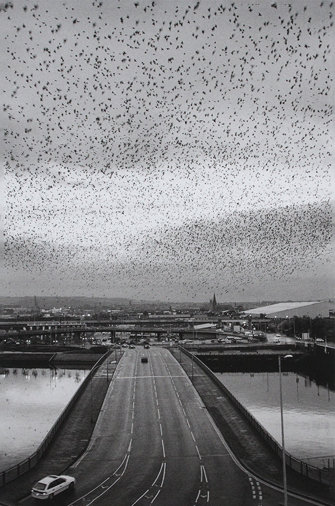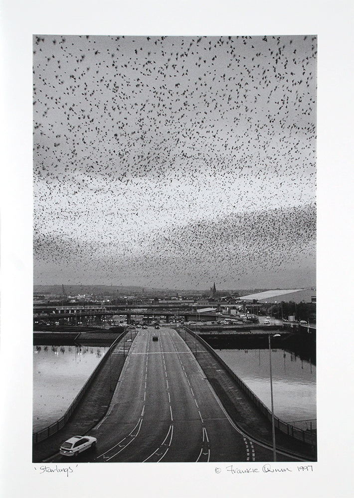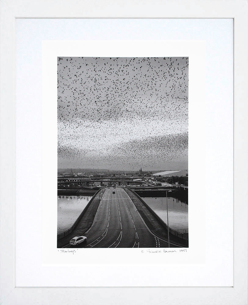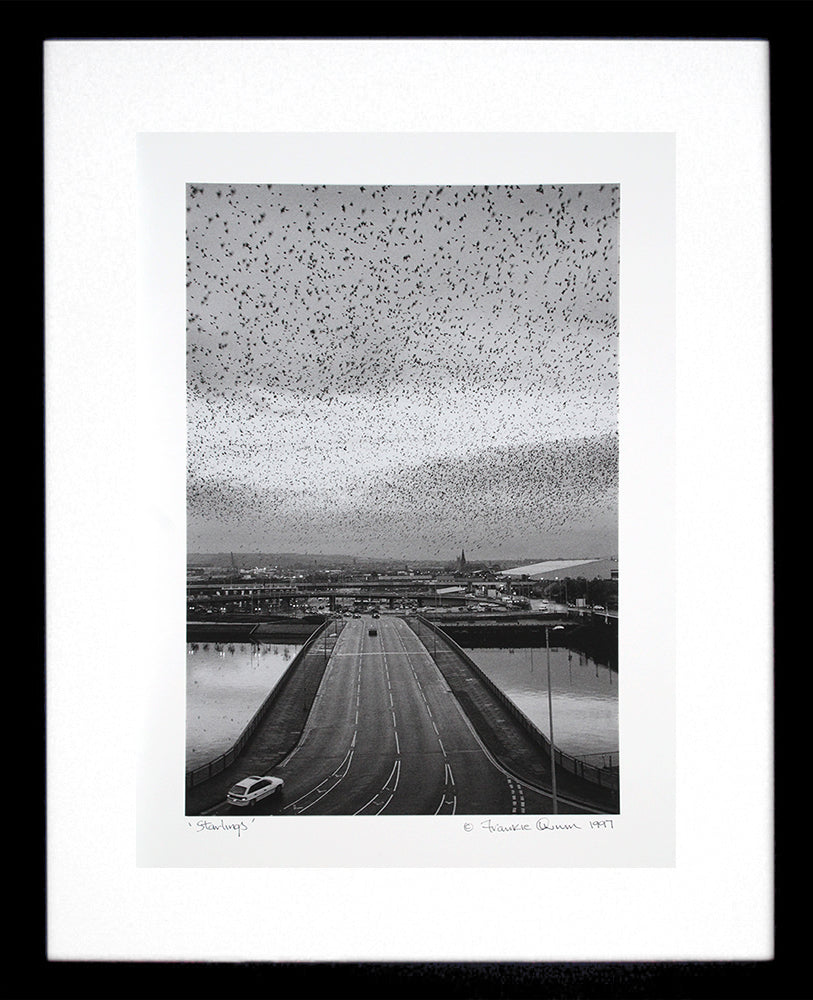 'Starlings 1997' is a signed and titled photographic print by Frankie Quinn. A familiar scene which became synonymous with the bridges spanning the River Lagan.