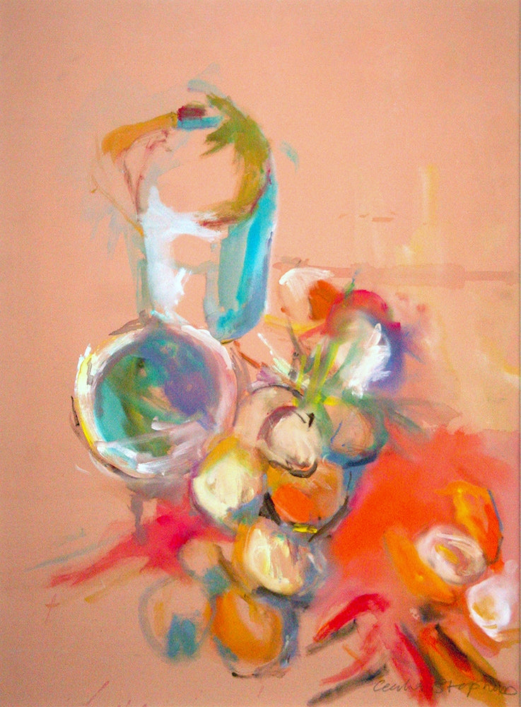 ‘Still Life With Chillies' is an original, signed pastel chalk drawing by Cecilia Stephens.