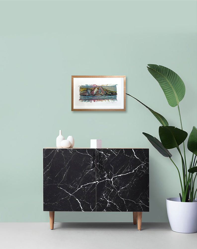 'Humbled By The Cliffs' is an original, hand coloured, woven tapestry by Cecilia Stephens.