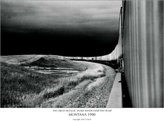 Photograph of a freight train travelling through the Montana landscape, along a track known as the 'Highline'.