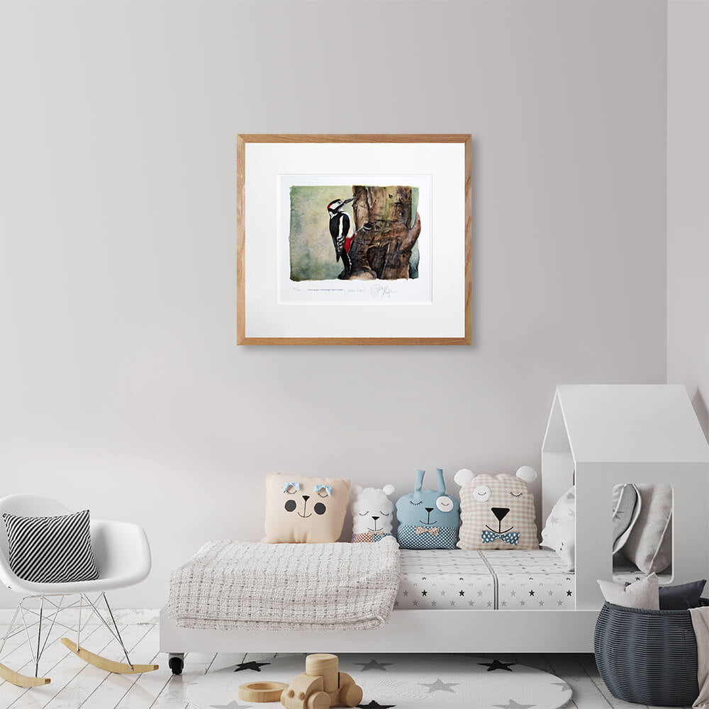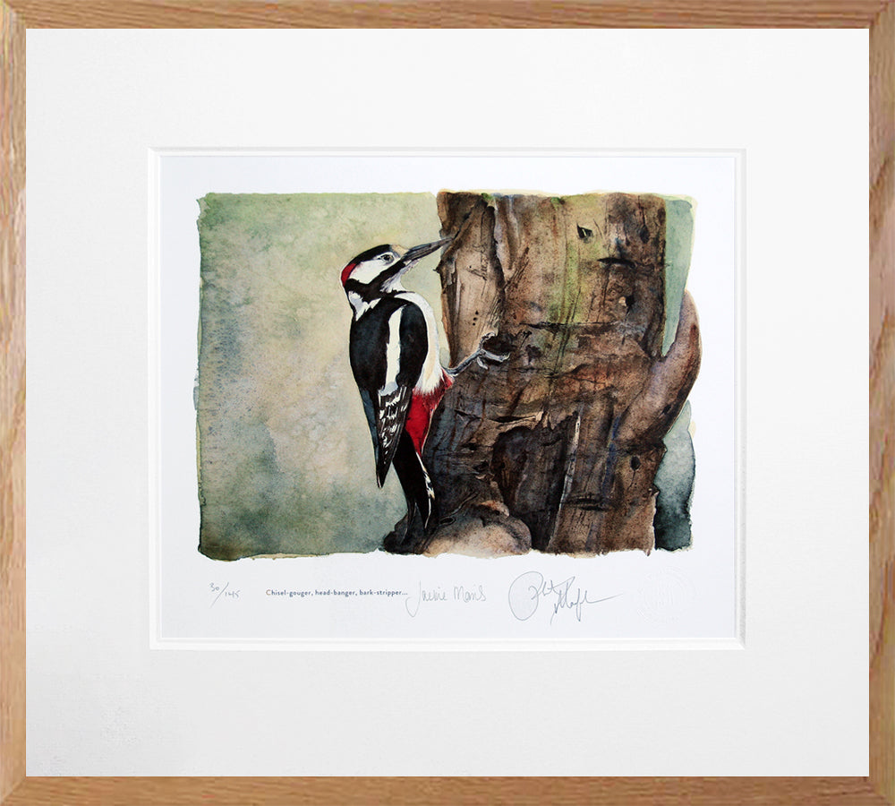 'Great Spotted Woodpecker' is a limited edition Giclee print of 145, from the book 'The Lost Spells', signed by both the author Robert Macfarlane and illustrator Jackie Morris. Printed on 315gsm 100% cotton rag archival paper, the print comes with a Certificate of Authenticity and is held in a white double mount.
