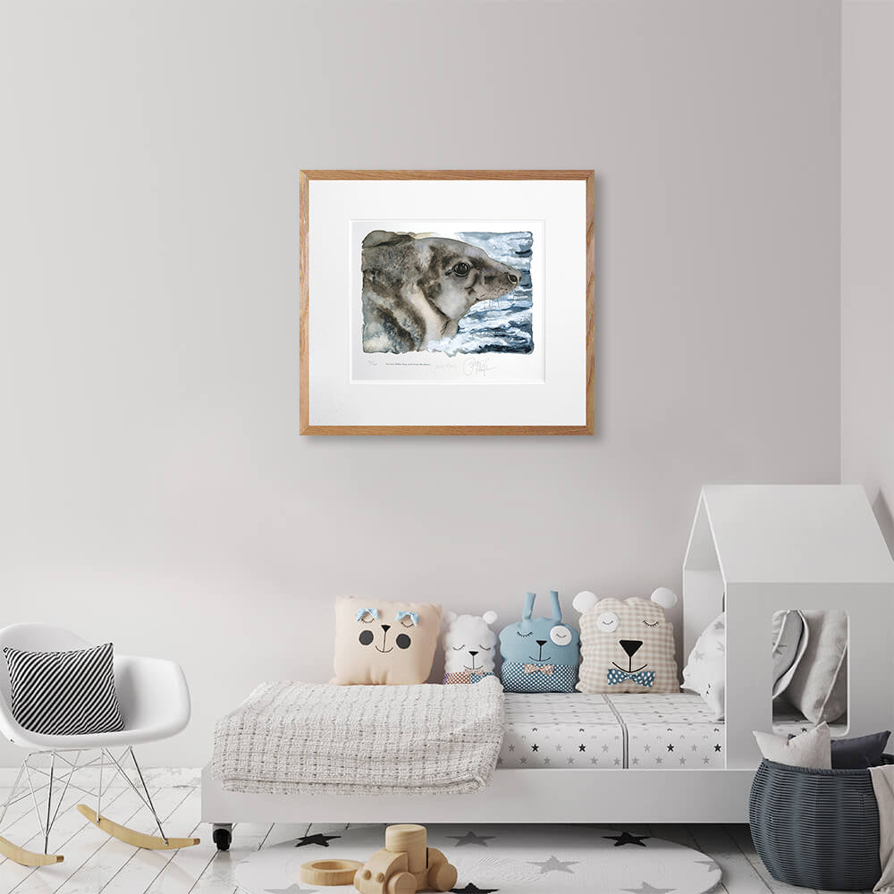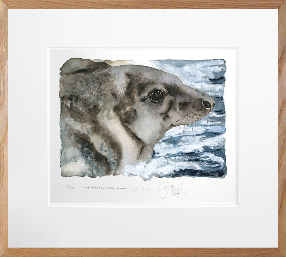 'Grey Seal' is a limited edition Giclee print of 145, from the book 'The Lost Spells', signed by both the author Robert Macfarlane and illustrator Jackie Morris. Printed on 315gsm 100% cotton rag archival paper, the print comes with a Certificate of Authenticity and is held in a white double mount.
