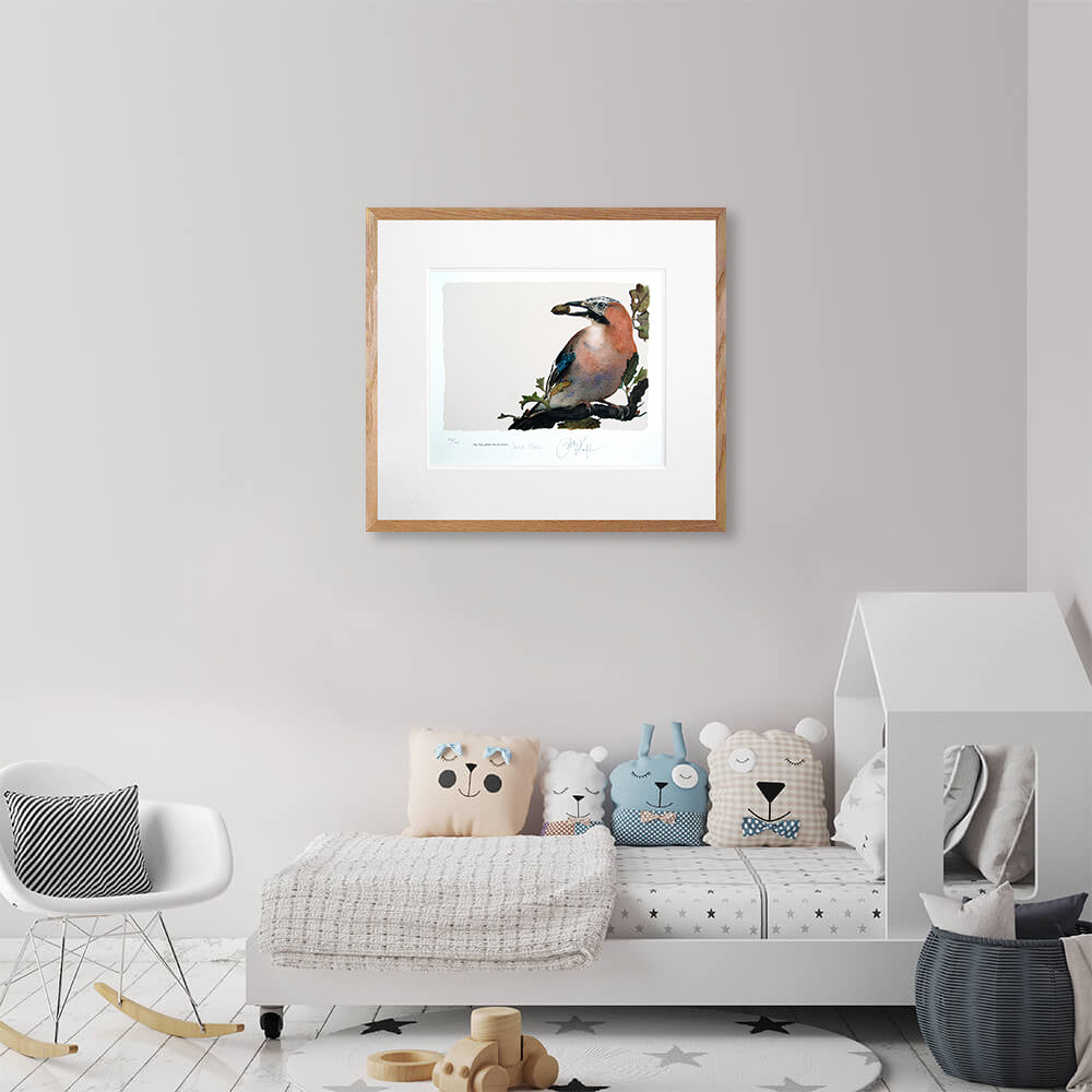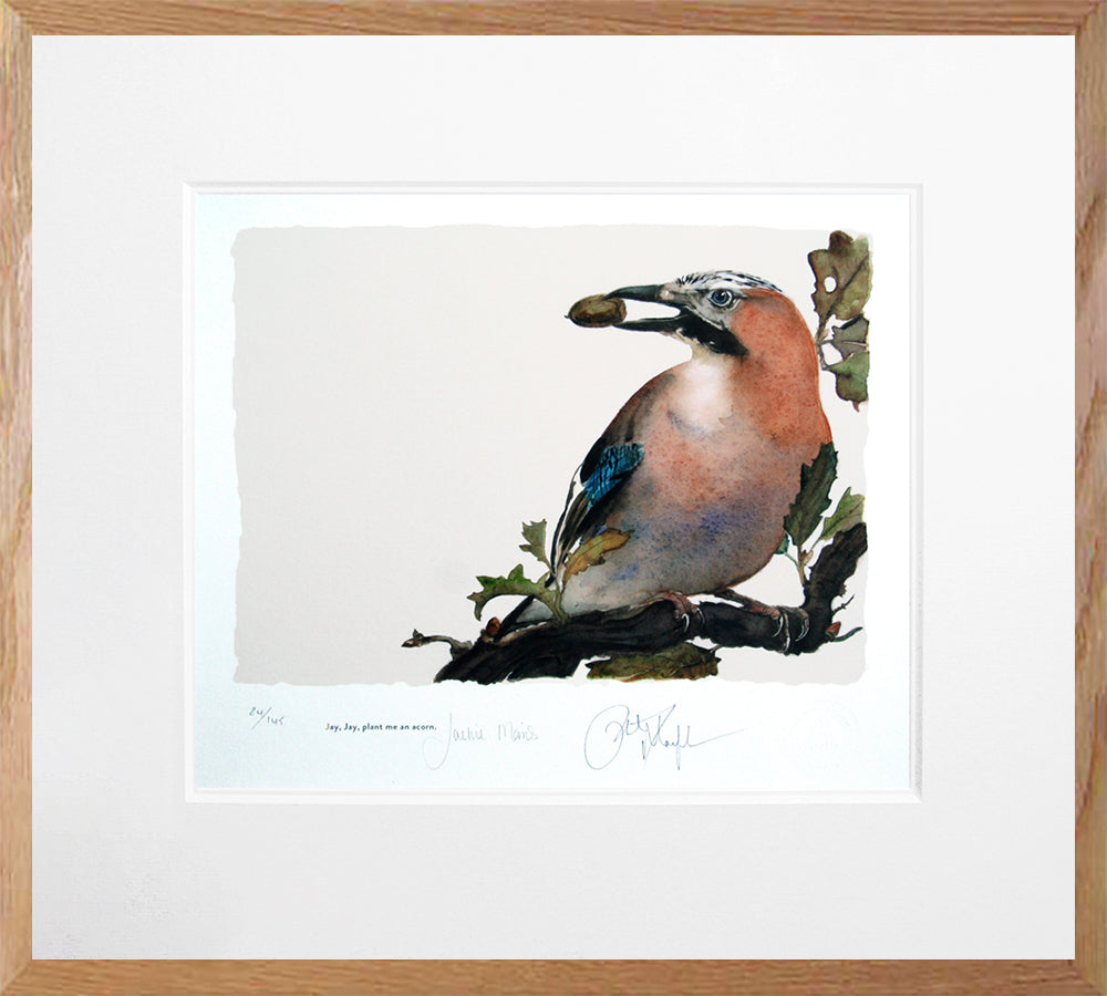 'Jay' is a limited edition Giclee print of 145, from the book 'The Lost Spells', signed by both the author Robert Macfarlane and illustrator Jackie Morris. Printed on 315gsm 100% cotton rag archival paper, the print comes with a Certificate of Authenticity and is held in a white double mount.