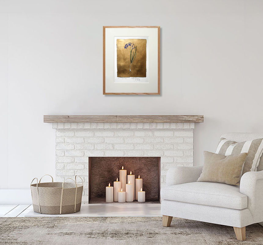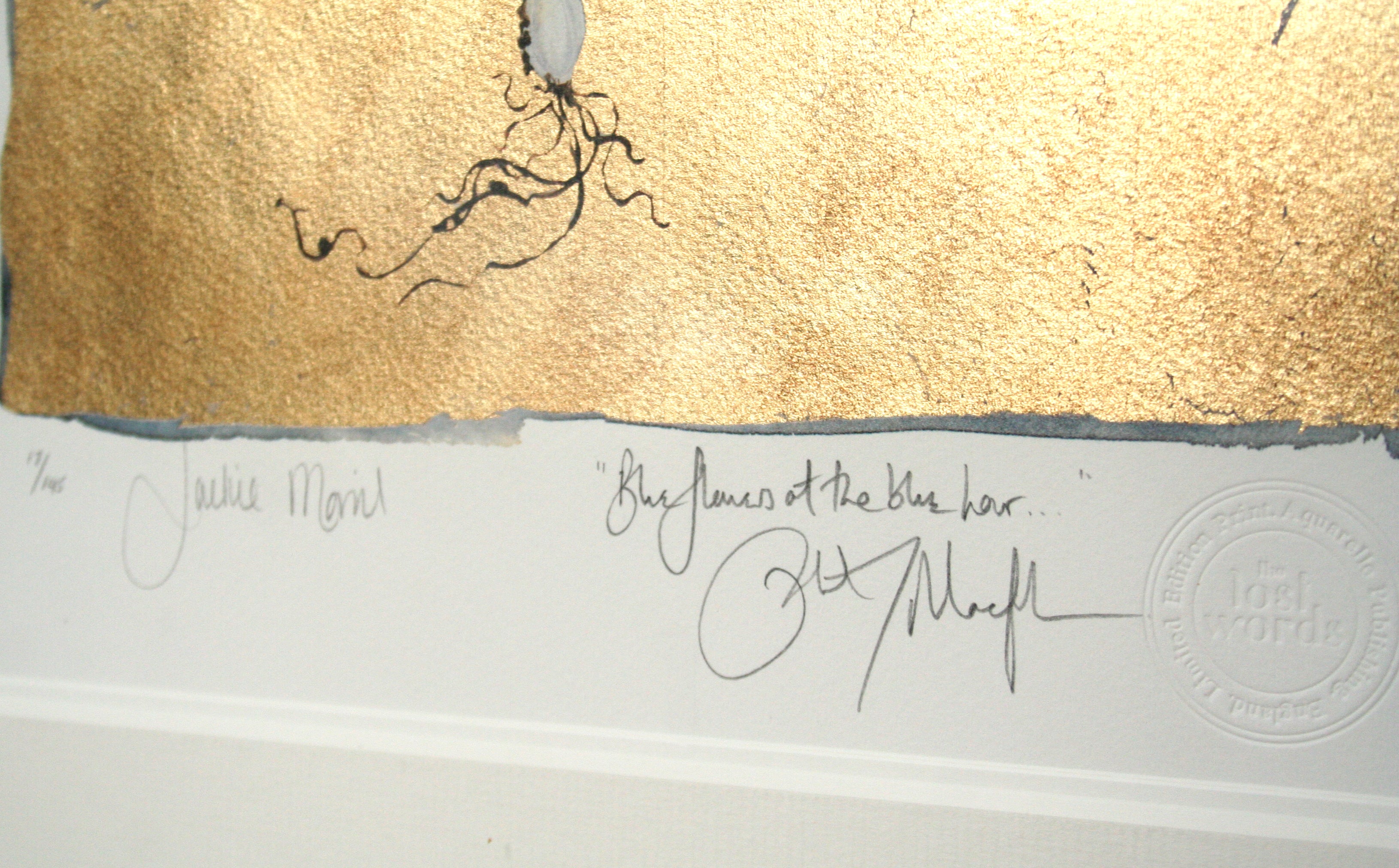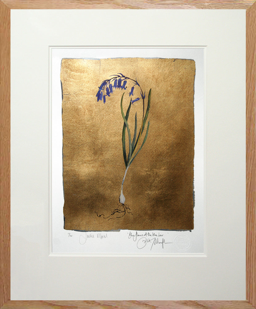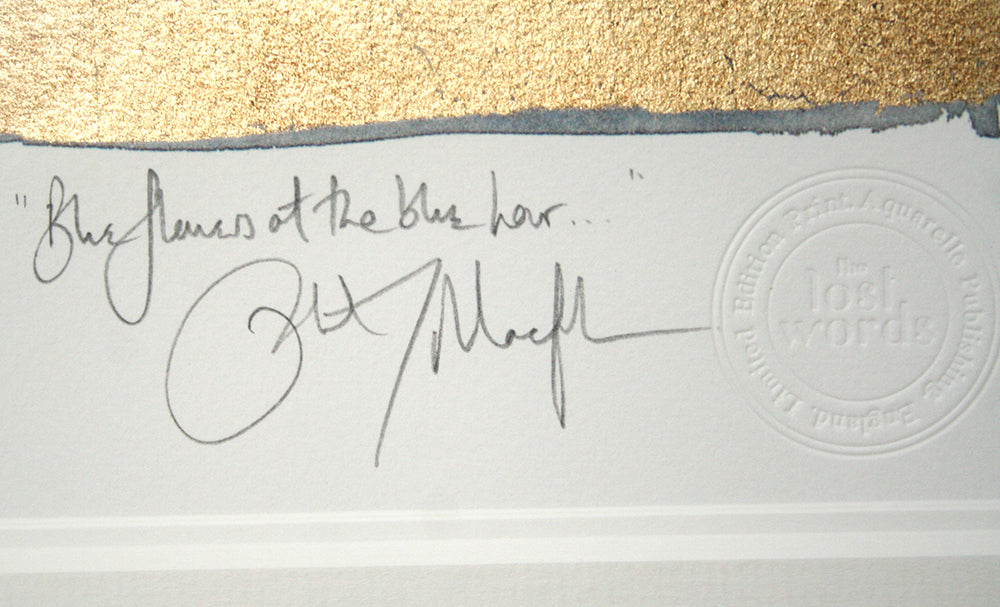 'Bluebell' is a limited edition Giclee print of 145, from the book 'The Lost Words', signed by both the author Robert Macfarlane and illustrator Jackie Morris. This Premium Edition has hand applied 'gold' leaf and handwritten spell quotation by Robert Macfarlane. Printed on 315gsm Somerset velvet 100% cotton rag archival paper, the print comes with a Certificate of Authenticity and is held in a white double mount.