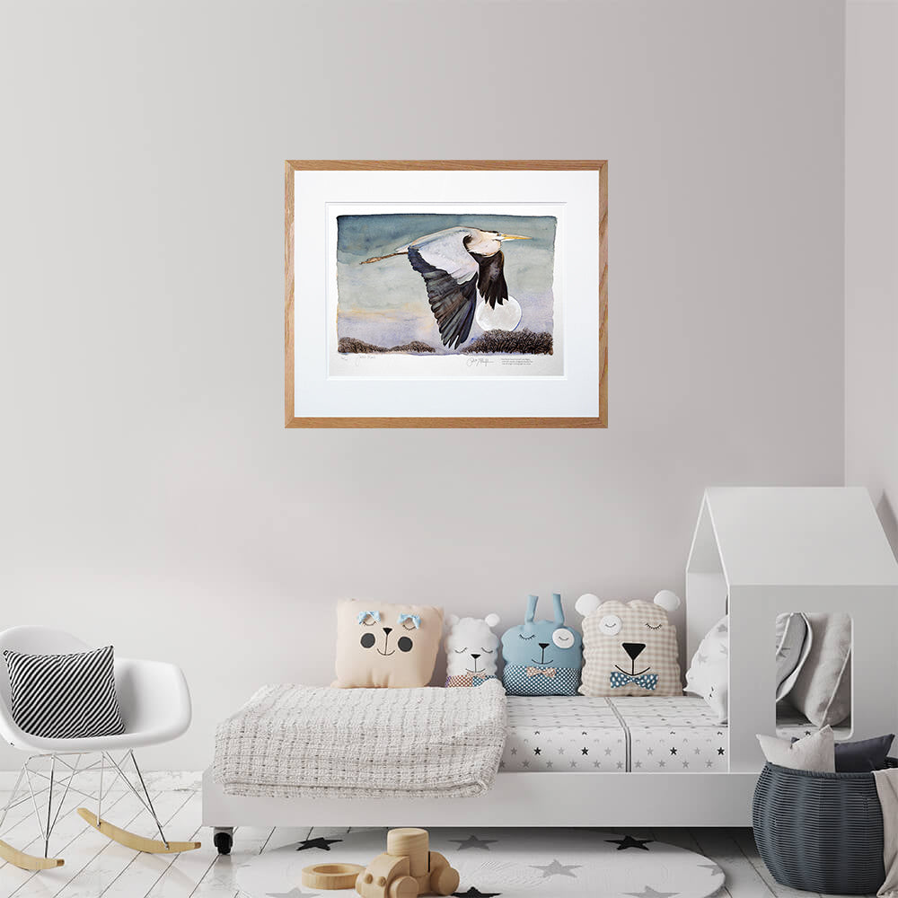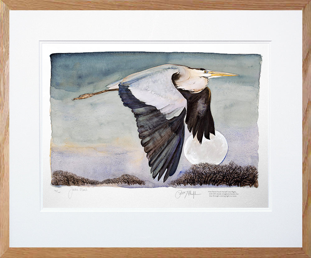 'Heron In Flight' is a limited edition Giclee print of 145, from the book 'The Lost Words', signed by both the author Robert Macfarlane and illustrator Jackie Morris. Printed on 315gsm 100% cotton rag archival paper, the print comes with a Certificate of Authenticity and is held in a white double mount.