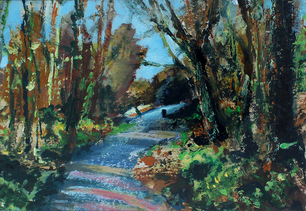 'Forest Path' is a signed, original, acrylic painting by Valerie Giannandrea McKeag.