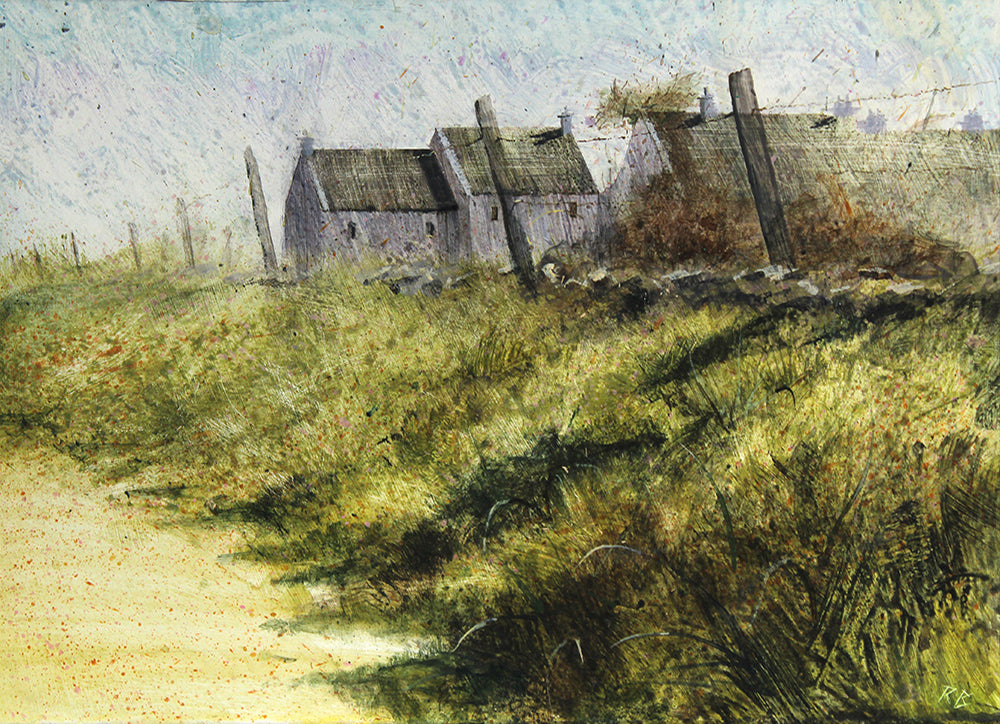 'White Washed Cottages At Kearney Village' is a signed, original, acrylic on board painting by Ray Belletty which was painted on location 'en plein air' in an impressionistic style.