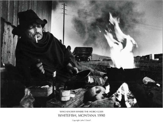 These photos were taken by director and film maker John T Davis during the making of the critically acclaimed film 'Hobo'. Hobo is an intensely personal portrait of the classic American railroad traveller. A wandering man, cast by choice into the world outside the law, into a world that has its own values and codes, a culture that still exists in America.